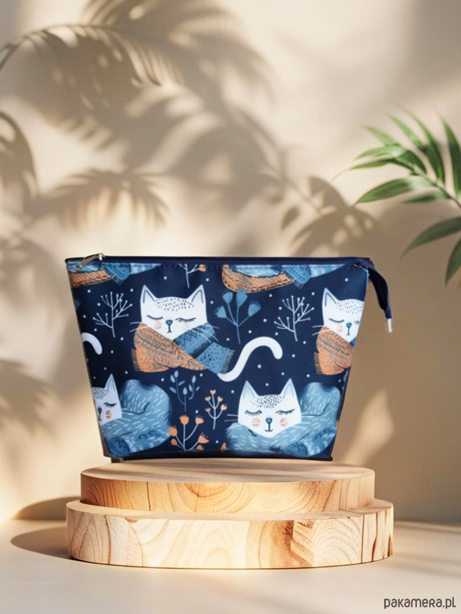 Wodoodporna kosmetyczka z motywem śpiących kotków w granatowo-niebieskiej kolorystyce. Pojemna, z wewnętrzną kieszonką – idealna dla kociarzy i na prezent!