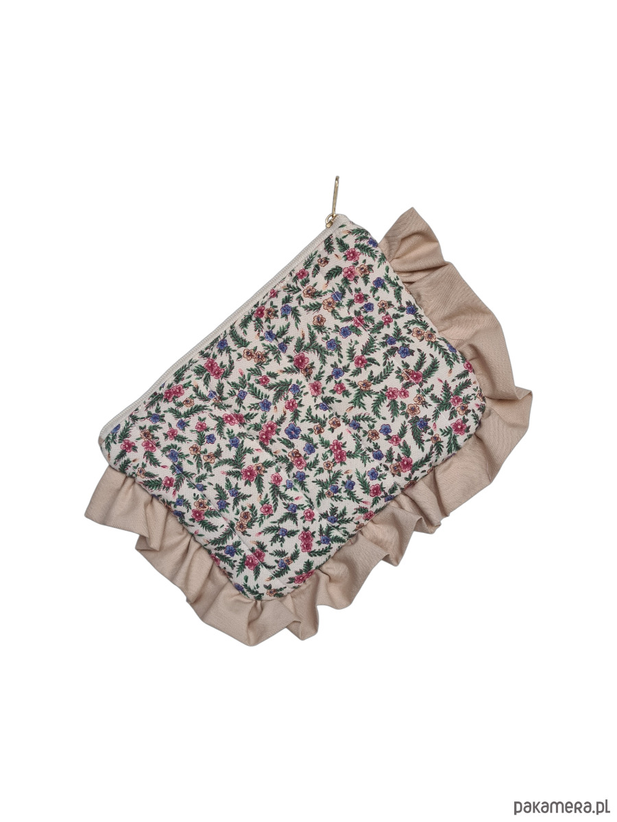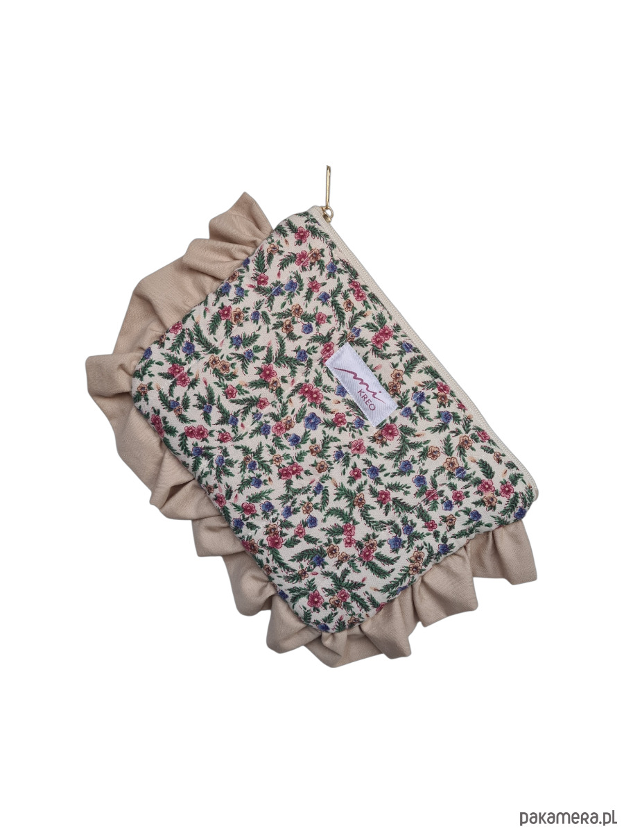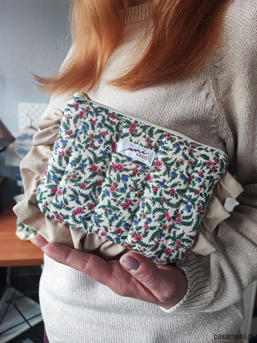 Jej delikatna falbanka dodaje lekkości i uroku, a klasyczny zamek sprawia, że wszystko pozostaje bezpiecznie na swoim miejscu. Pikowanie dodaje jej miękkości i dodatkowo chroni przedmioty w kosmetyczce.