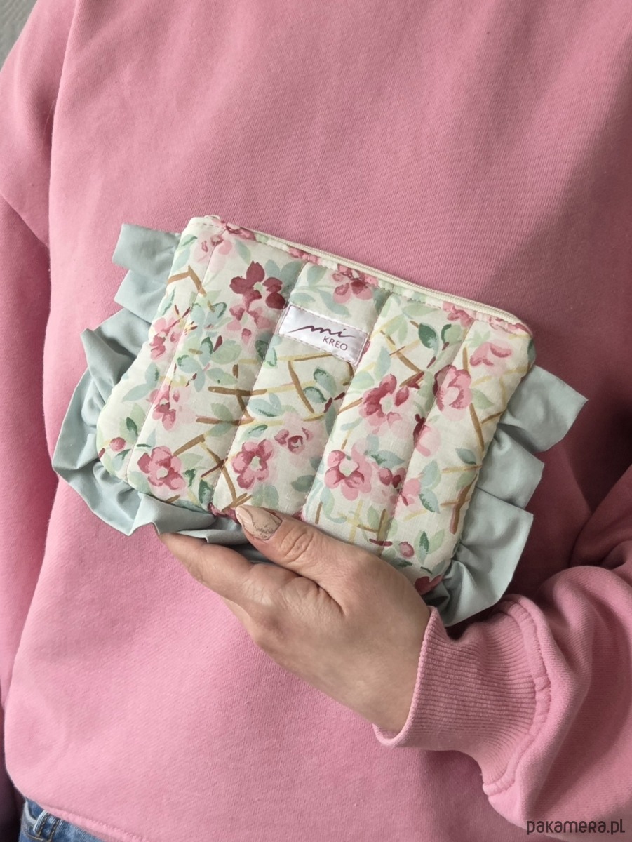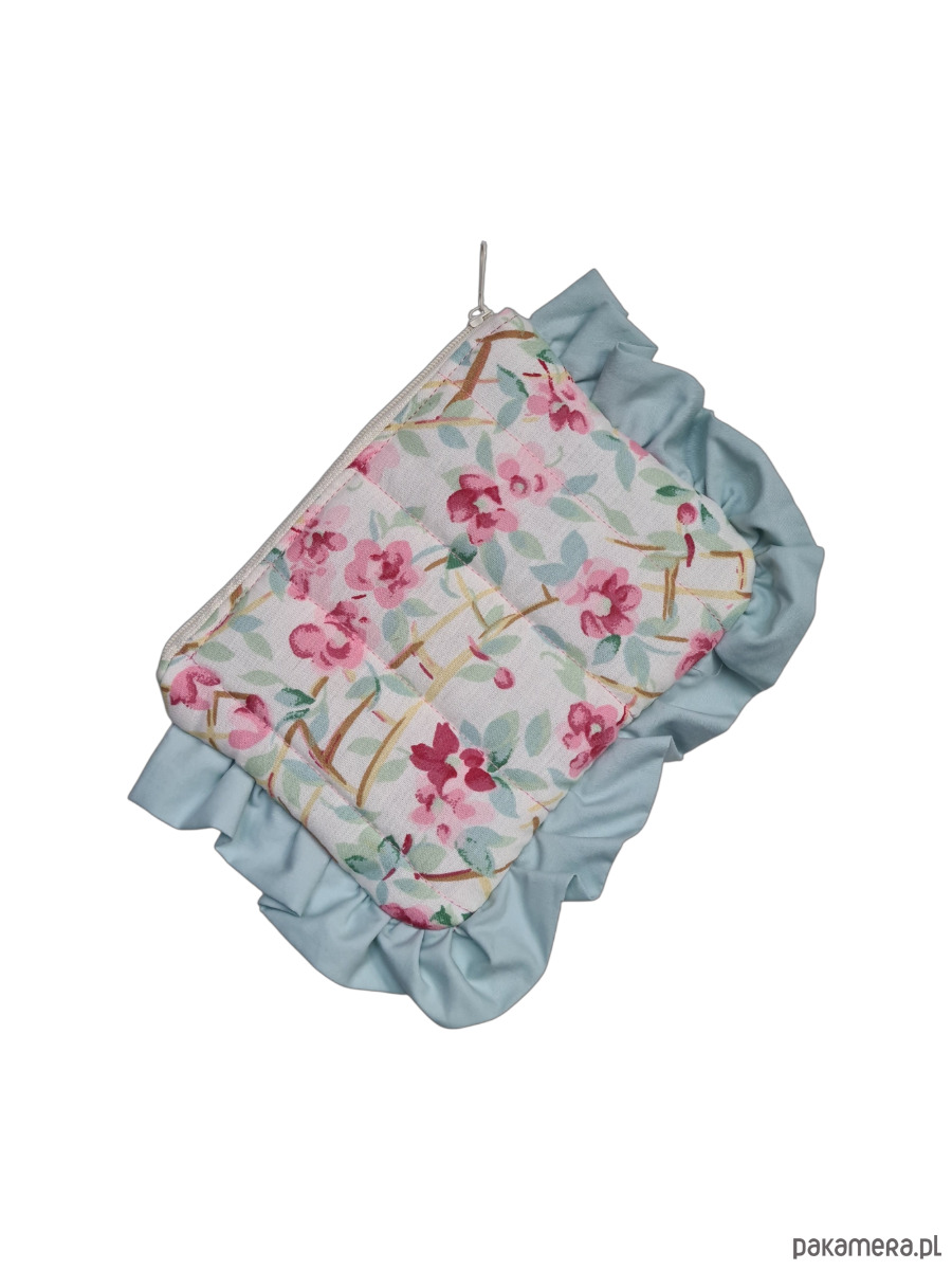 Jej delikatna falbanka dodaje lekkości i uroku, a klasyczny zamek sprawia, że wszystko pozostaje bezpiecznie na swoim miejscu. Pikowanie dodaje jej miękkości i dodatkowo chroni przedmioty w kosmetyczce.