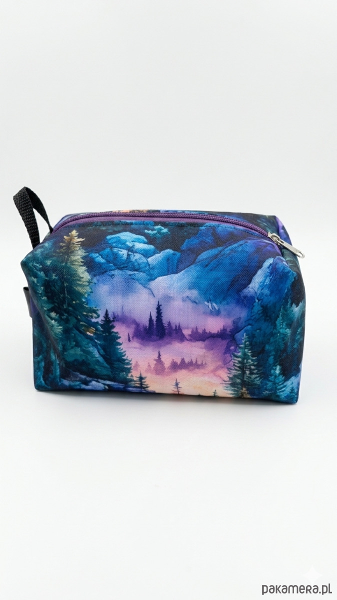 Kosmetyczka uszyta z tkaniny wodoodpornej w górski piękny wzór. Podszewka również z tkaniny wodoodpornej w kolorze różowym. Kosmetyczka posiada wygodny uchwyt.