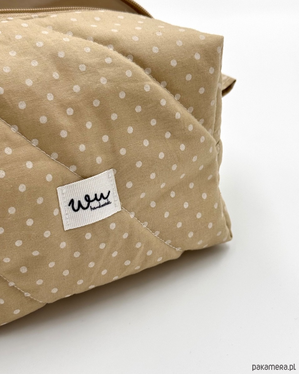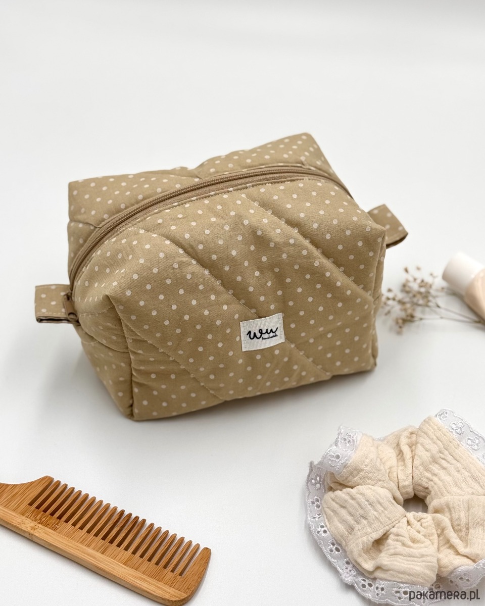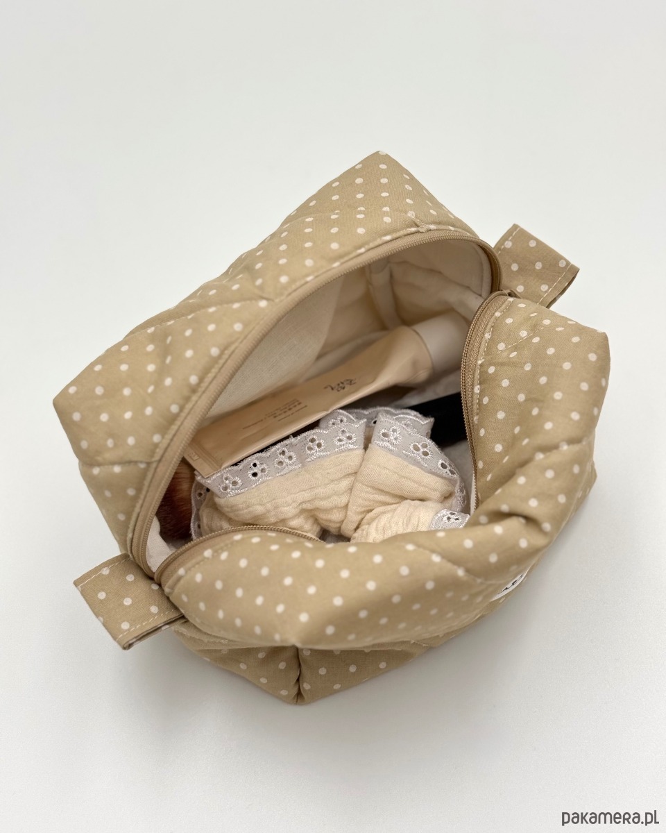 Delikatnie pikowana cienką warstwą włókniny, dzięki czemu dobrze trzyma kształt, a jednocześnie pozostaje miękka i lekka. Pojemna, praktyczna i idealna na kosmetyki, akcesoria lub drobiazgi — w podróży i na co dzień.
