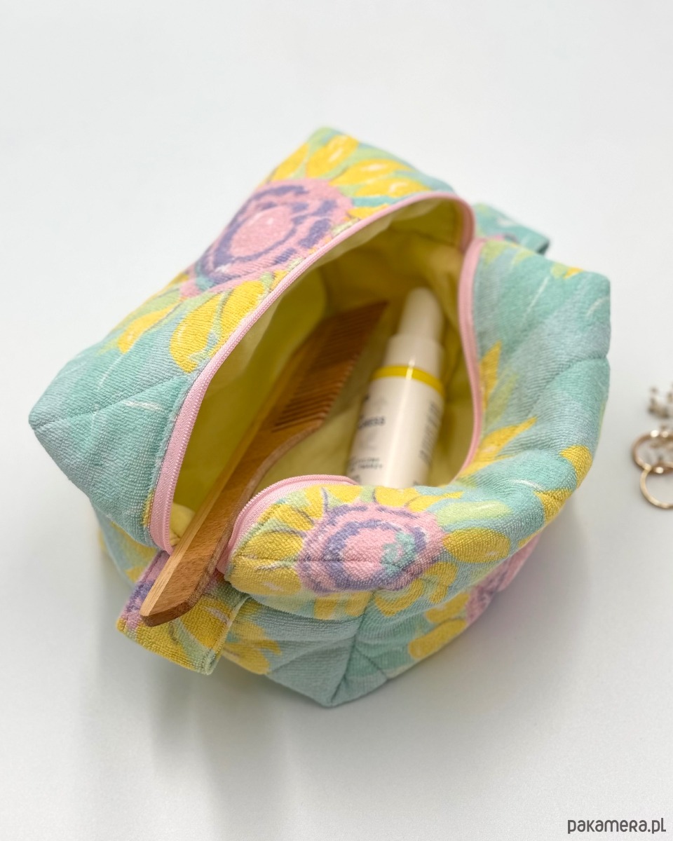 Delikatnie pikowana cienką warstwą włókniny, dzięki czemu dobrze trzyma kształt, a jednocześnie pozostaje miękka i lekka. Pojemna, praktyczna i idealna na kosmetyki, akcesoria lub drobiazgi — w podróży i na co dzień.