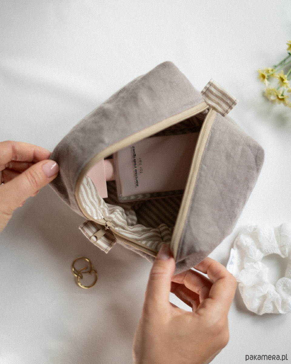 Delikatnie pikowana cienką warstwą włókniny, dzięki czemu dobrze trzyma kształt, a jednocześnie pozostaje miękka i lekka. Pojemna, praktyczna i idealna na kosmetyki, akcesoria lub drobiazgi — w podróży i na co dzień.