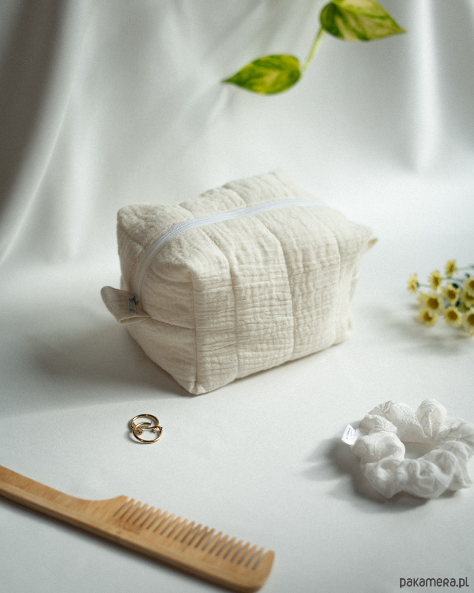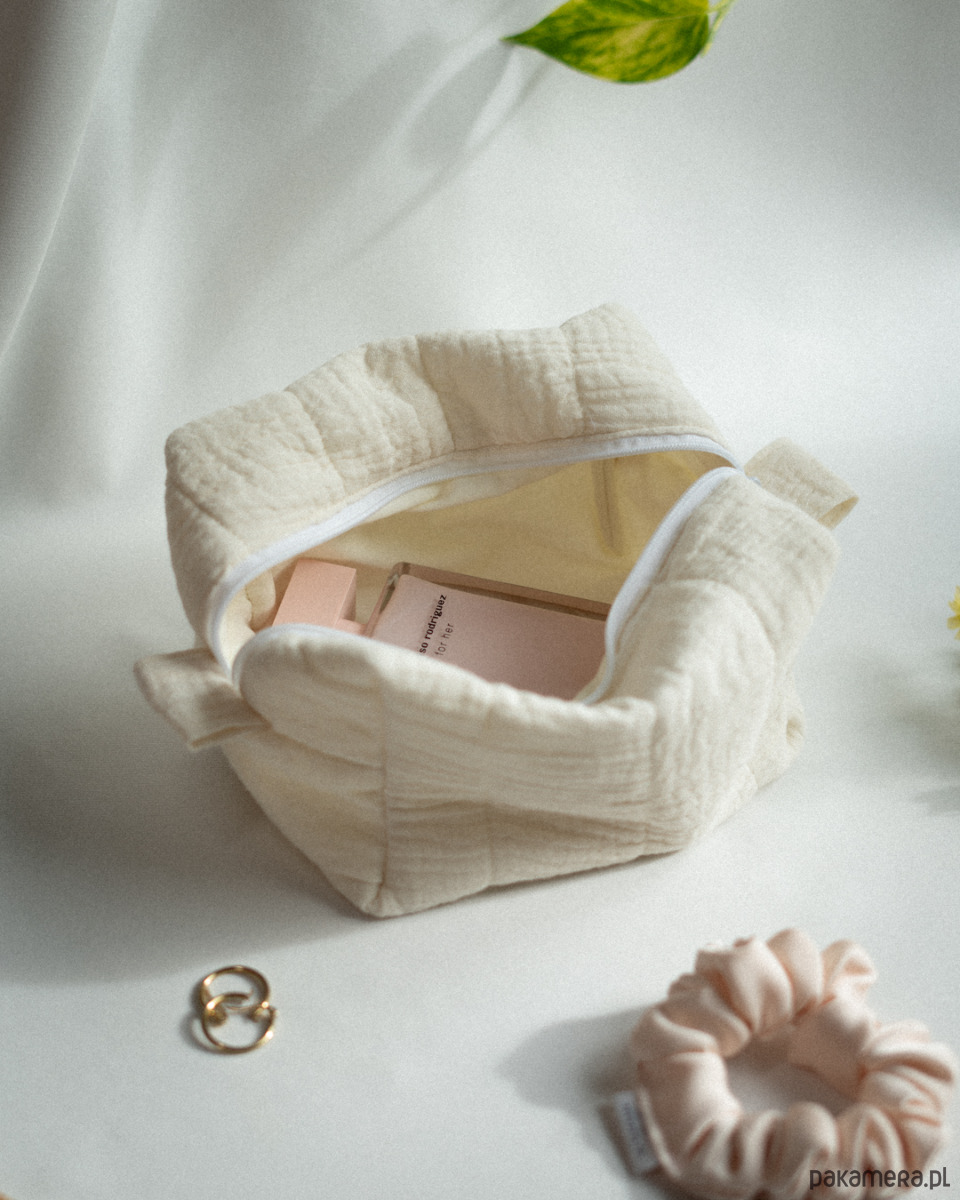 Delikatnie pikowana cienką warstwą włókniny, dzięki czemu dobrze trzyma kształt, a jednocześnie pozostaje miękka i lekka. Pojemna, praktyczna i idealna na kosmetyki, akcesoria lub drobiazgi — w podróży i na co dzień.
