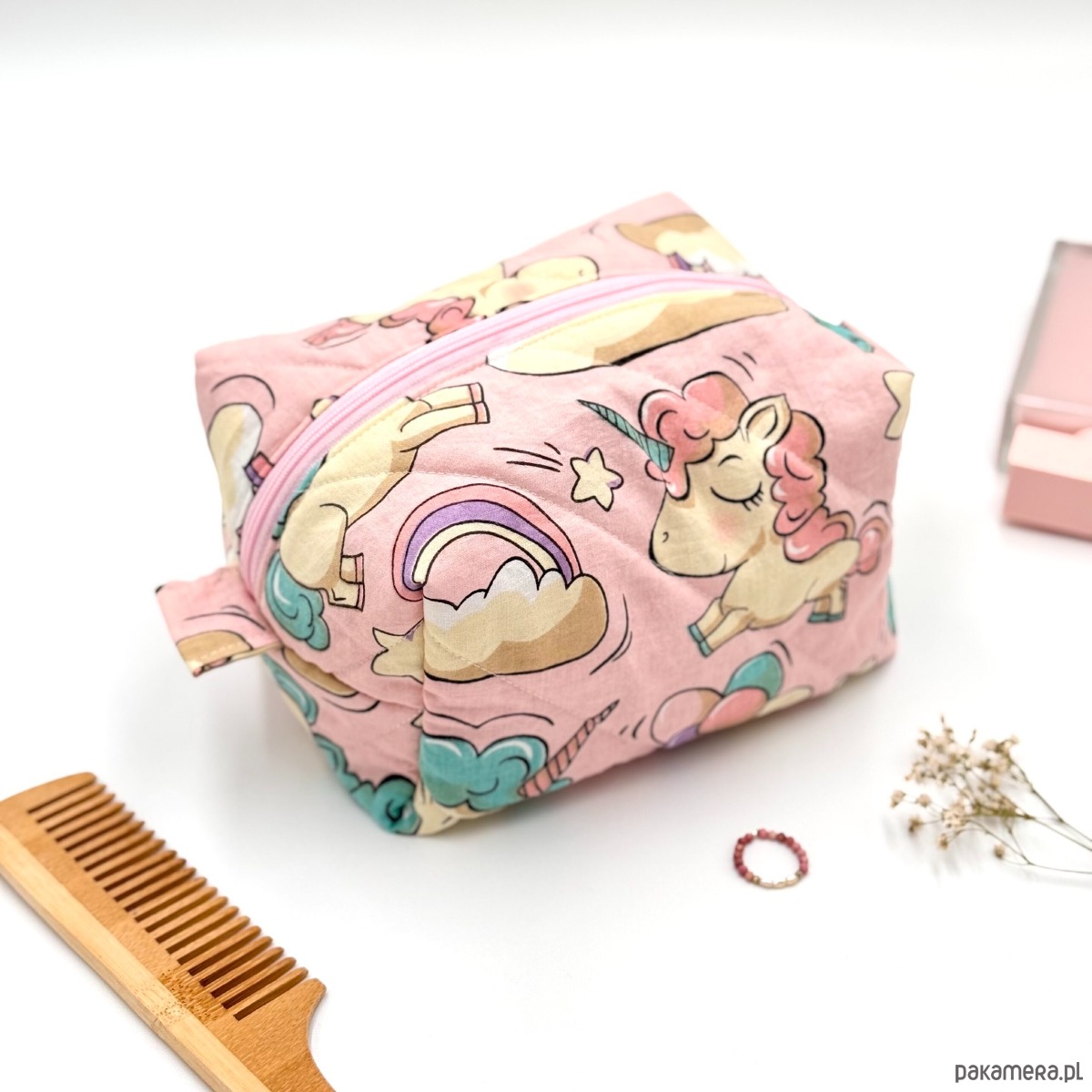 Pikowana cienką warstwą włókniny, dzięki czemu zachowuje kształt, a jednocześnie pozostaje lekka i miękka w dotyku. Pojemna, idealna do przechowywania kosmetyków, akcesoriów lub drobiazgów w podróży i na co dzień.