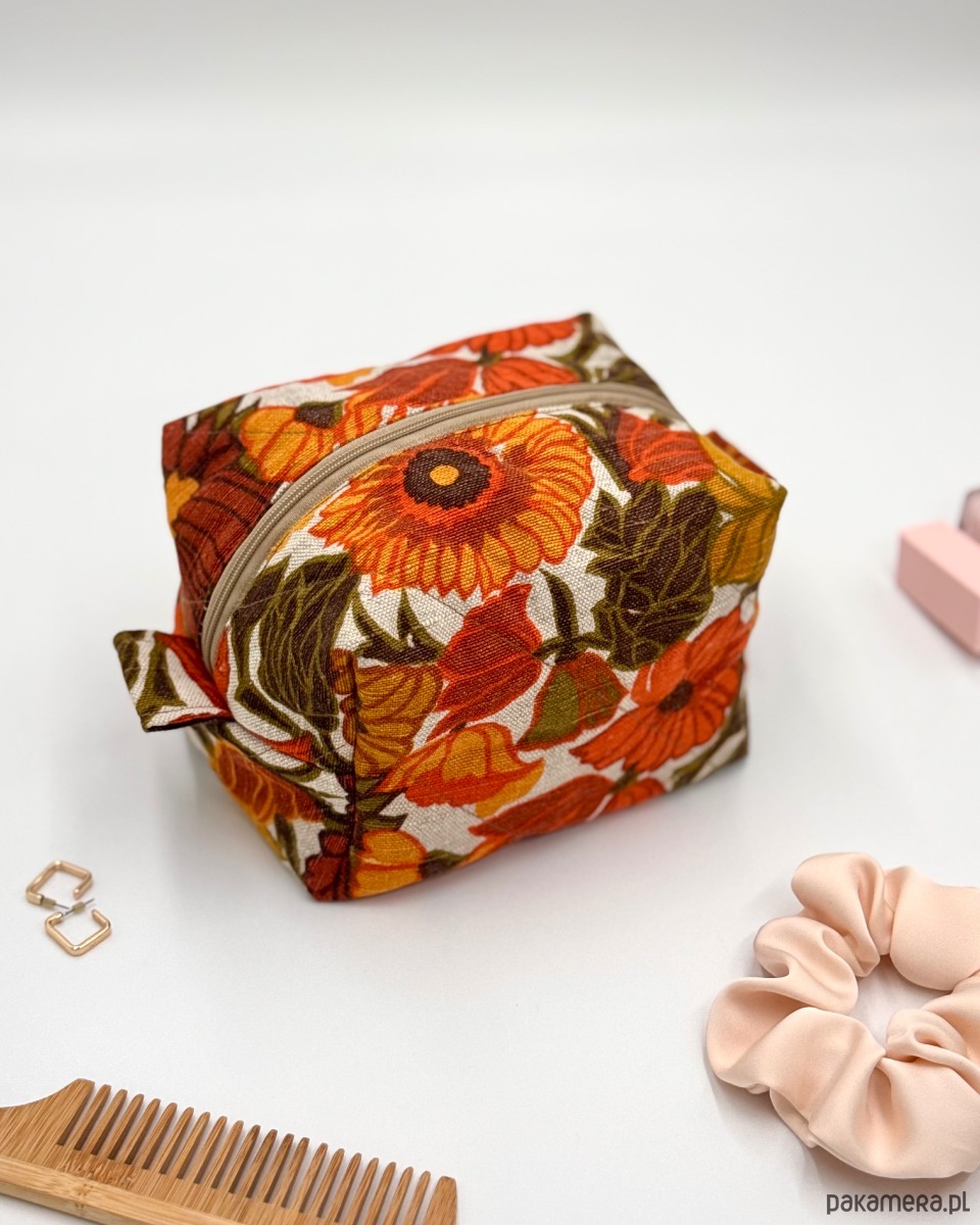 Kosmetyczka kostka uszyta z tkanin z drugiego obiegu — każdy egzemplarz to unikat, którego nie da się powtórzyć.