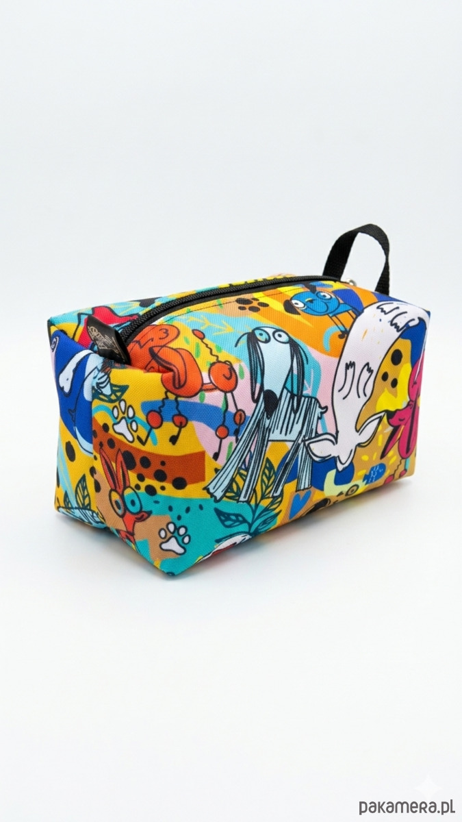 Kosmetyczka uszyta z tkaniny wodoodpornej w zabawne, abstrakcyjne postacie zwierząt (m.in. pieski o długich uszach, stworki z dużymi oczami) oraz motywy roślinne i łapki.