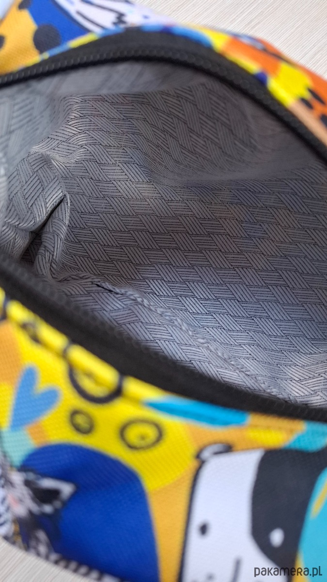Posiada czarny zamek błyskawiczny umieszczony na górze, który zapewnia łatwy dostęp do zawartości.