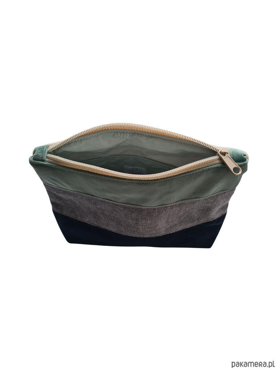 Kosmetyczka zapinana jest na zamek, a w środku posiada małą kieszonkę na drobiazgi. Szerokie dno pozwala ustawić kosmetyki pionowo, co ułatwia dostęp do zawartości i pomaga utrzymać porządek.