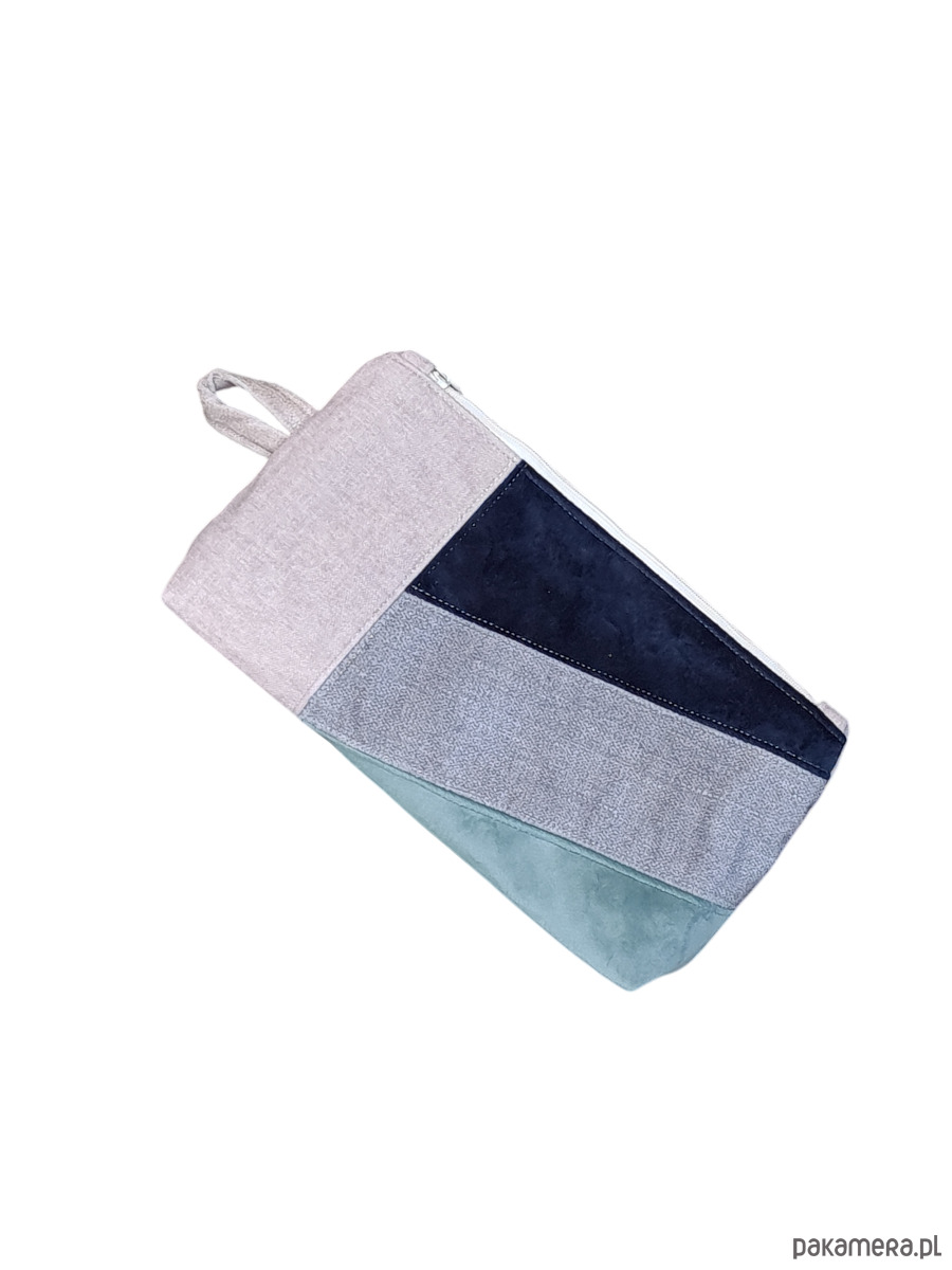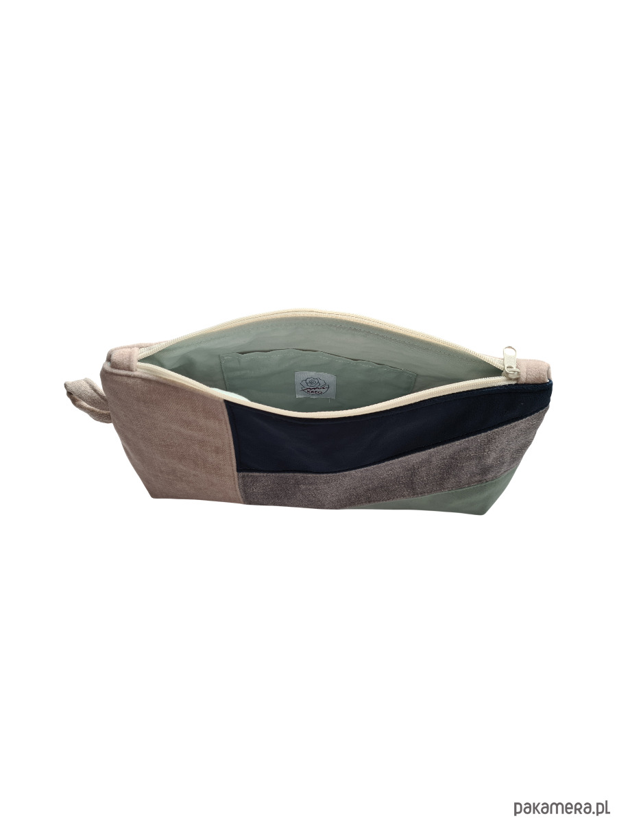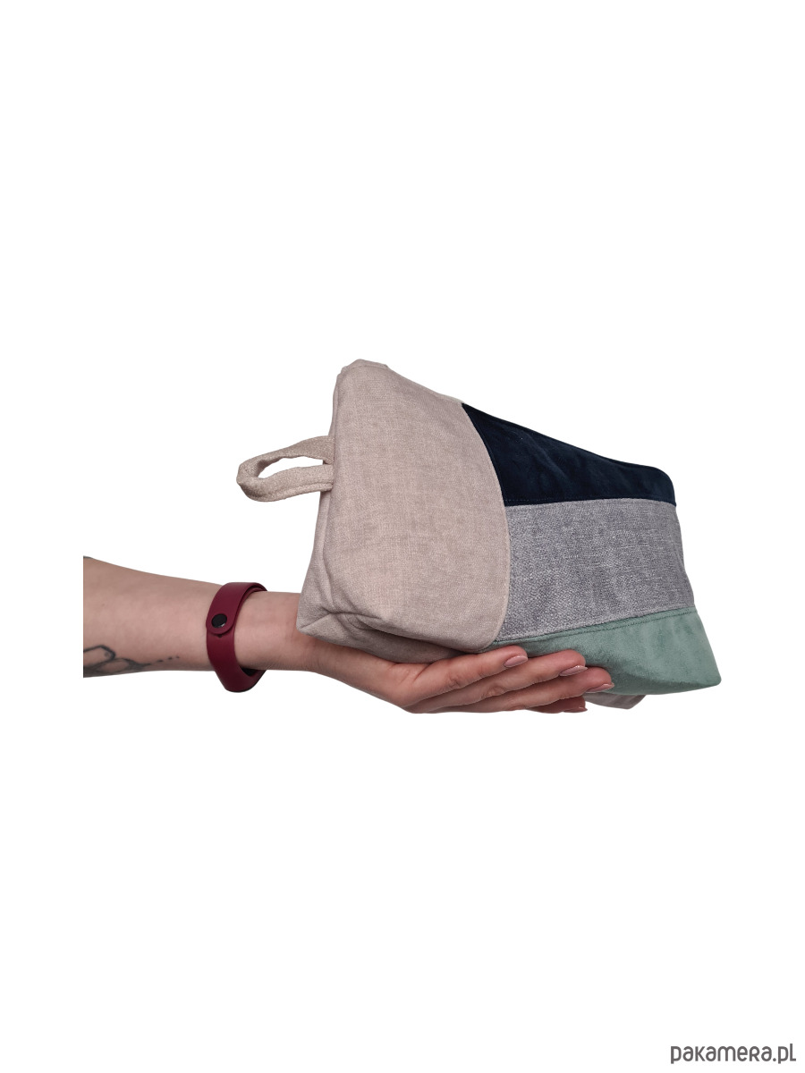 Kosmetyczka została uszyta z materiałów z drugiego obiegu - głównie ścinków tapicerskich, a także fragmentów pościeli i koszul. Tkaniny tapicerskie sprawiają, że kosmetyczka jest solidna i odporna na intensywne użytkowanie. Zamiast zostać odrzucone, zostały przekształcone w trwały i funkcjonalny dodatek. Każdy egzemplarz to inne zestawienie tkanin i kolorów, dzięki czemu jest naprawdę jedyny w swoim rodzaju.