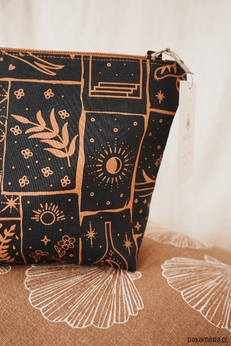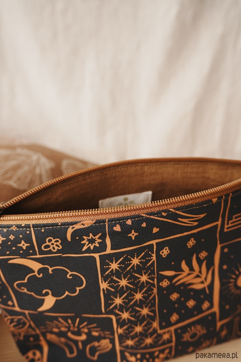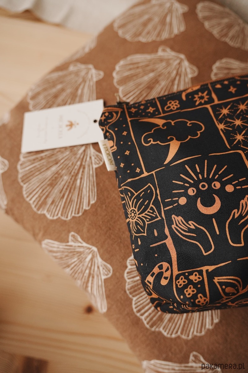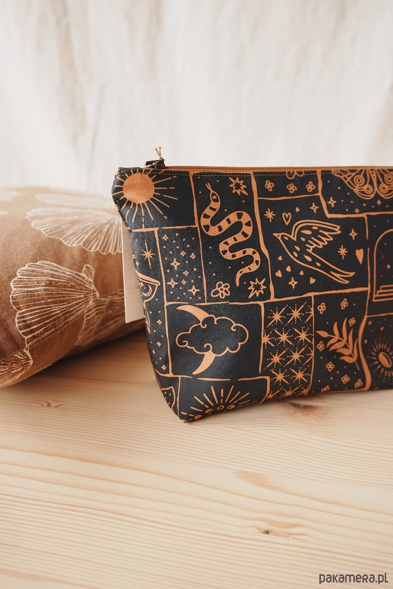 Na zewnątrz bawełniana tkanina w magiczny print. Wewnątrz lniana podszewka w kolorze karmelowym, ozdobiona bawełnianą metką z logo marki. Całość zapinana na dobrany kolorystycznie zamek błyskawiczny z rustykalną końcówką.