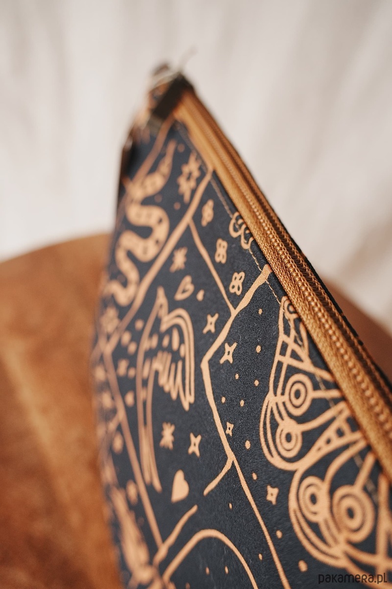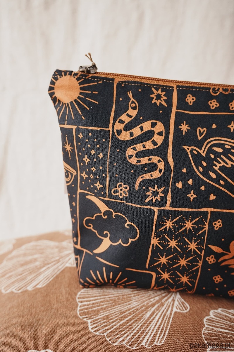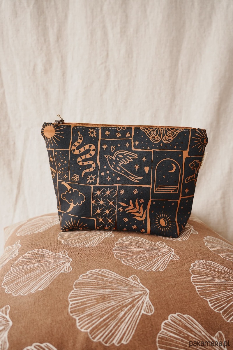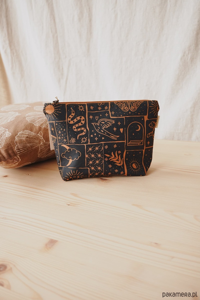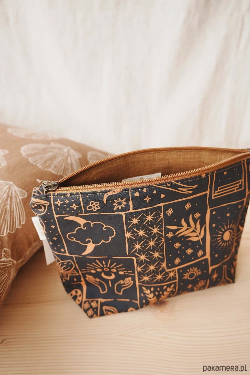 Na zewnątrz bawełniana tkanina w magiczny print. Wewnątrz lniana podszewka w kolorze karmelowym, ozdobiona bawełnianą metką z logo marki. Całość zapinana na dobrany kolorystycznie zamek błyskawiczny z rustykalną końcówką.