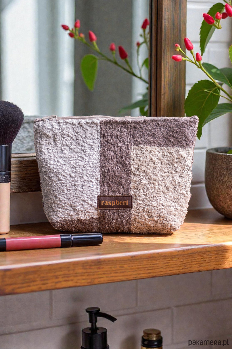 Duża kosmetyczka w kolorze beżowym/szarym/kawy z mlekiem z tkaniny typu bukla.