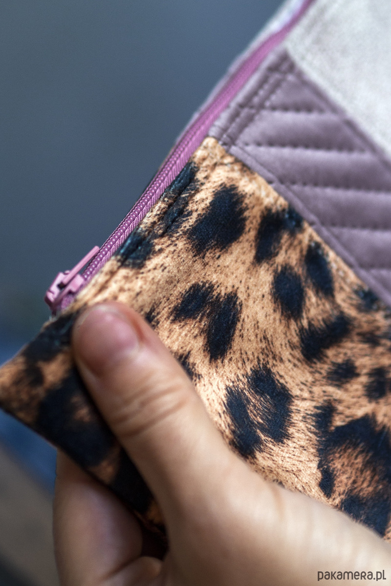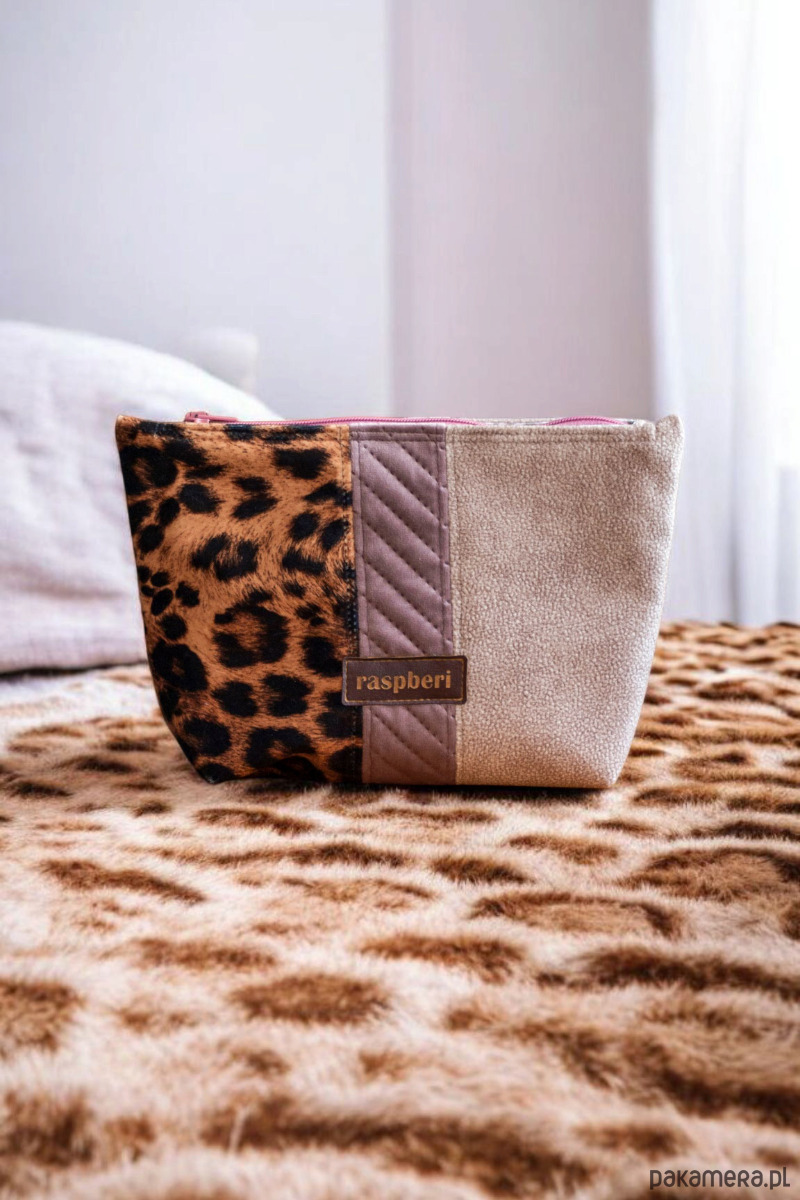 Duża kosmetyczka z weluru w panterkę i beżowego weluru oraz pikowanego weluru w kolorze pudroworóżowym. Bardzo przyjemna w dotyku. Wykonana w duchu no waste.