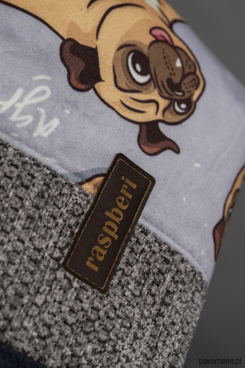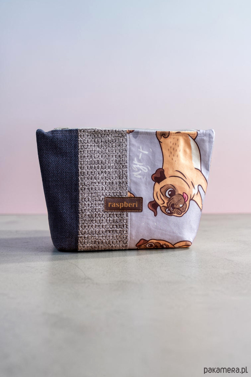 Duża kosmetyczka w kolorze granatowo-szarym w mopsy. Stworzona w duchu no waste.