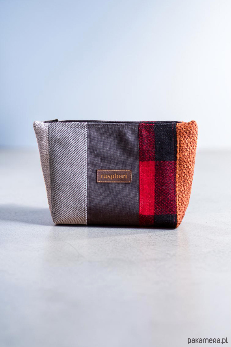Duża kosmetyczka stworzona w duchu no waste z kilku rodzajów kolorowych tkanin.