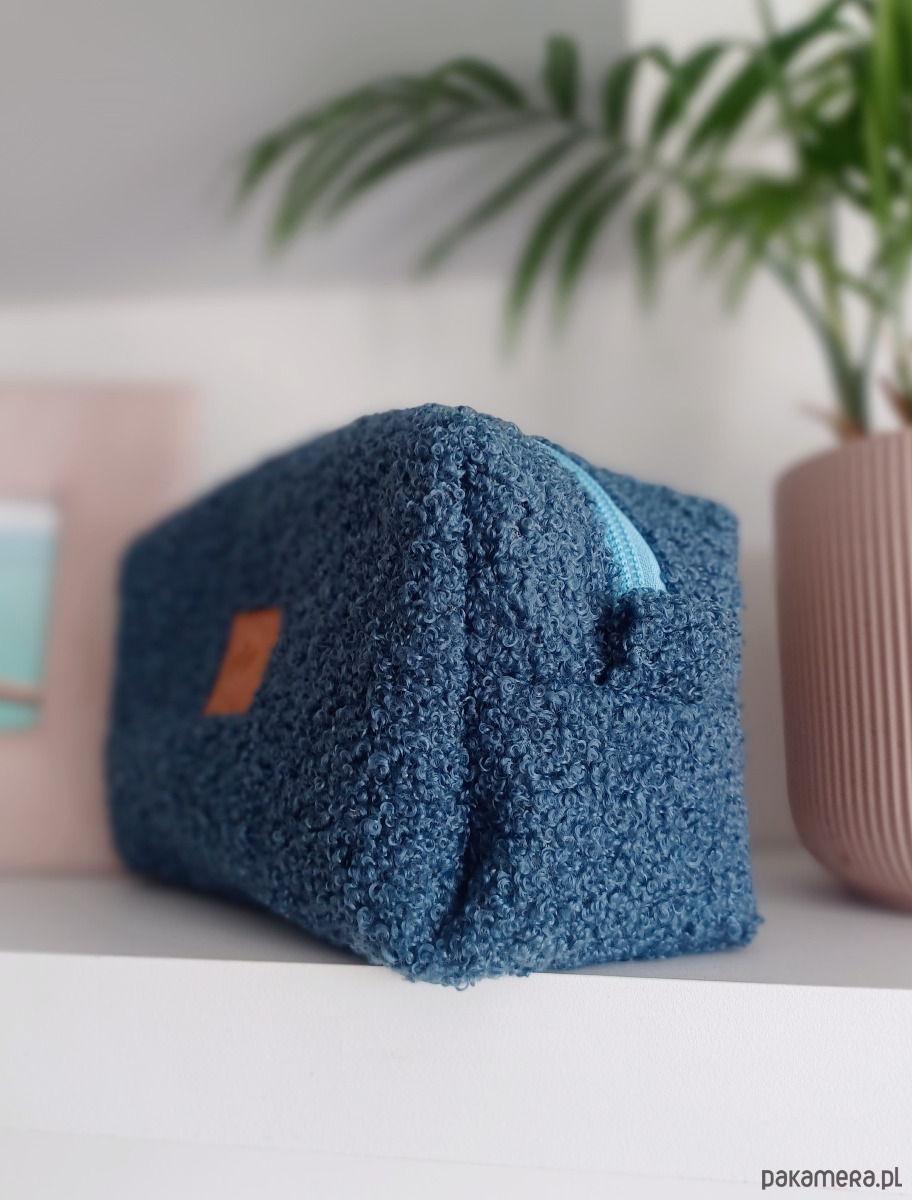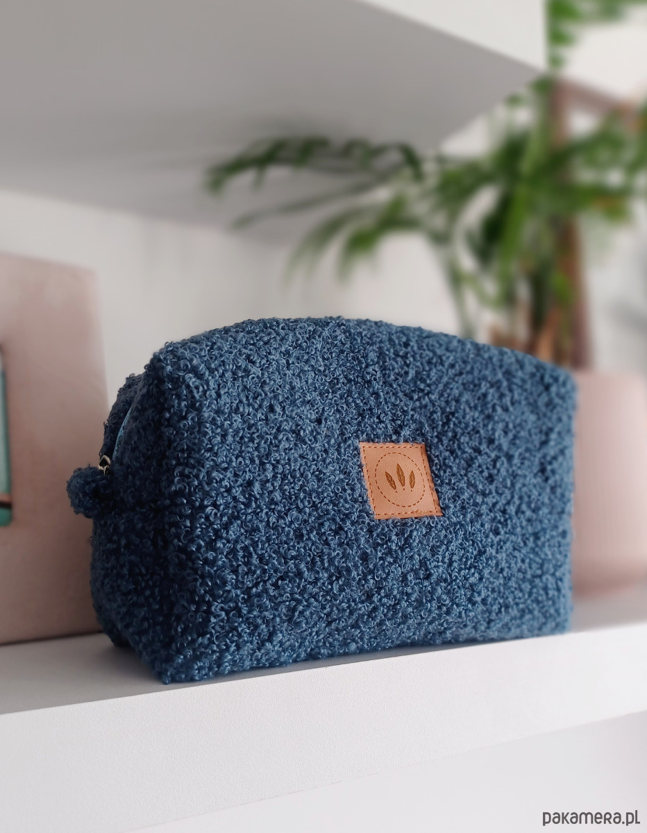 Średniej wielkości kosmetyczka z mięciutkiej tkaniny przypominającej futerko baranka.