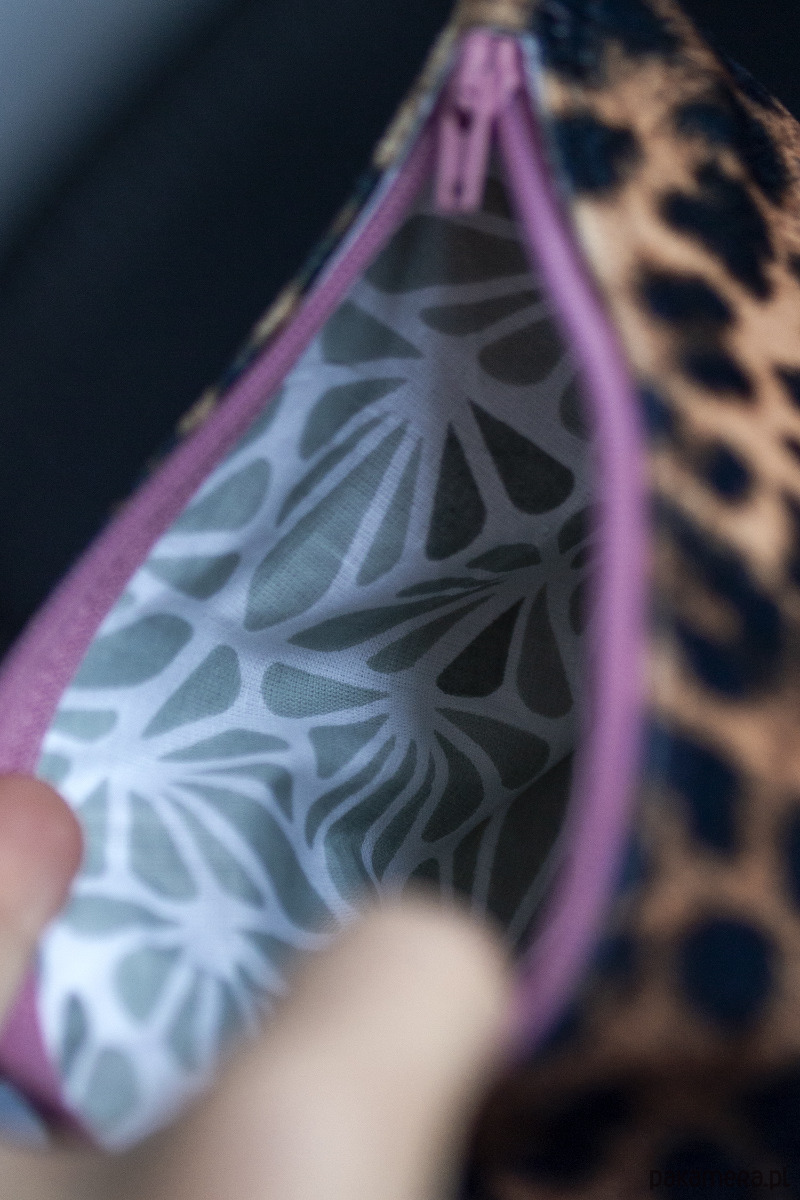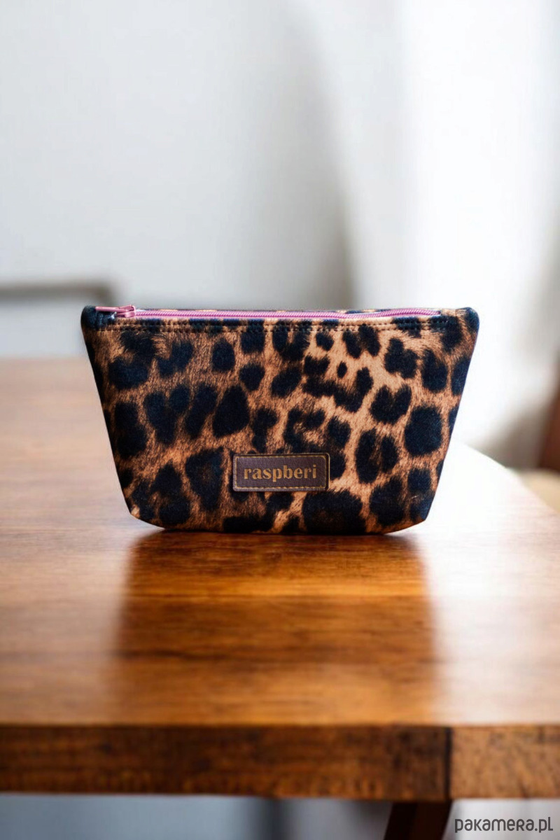 Średniej wielkości kosmetyczka wykonana z weluru w panterkę.