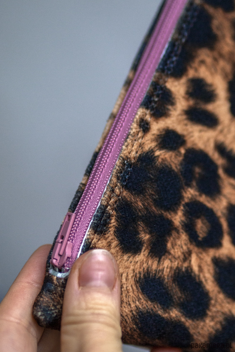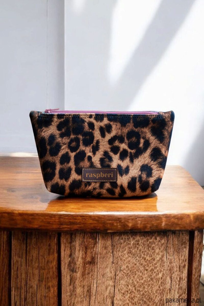 Średniej wielkości kosmetyczka wykonana z weluru w panterkę.