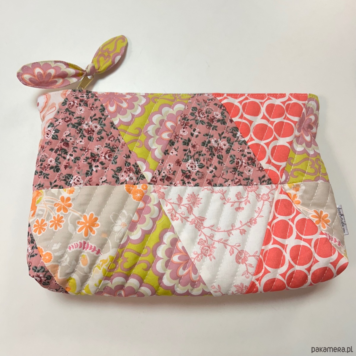 Przedstawiam patchworkową kosmetyczkę w odcieniach beżu i pomarańczu, stworzoną z najwyższej jakości bawełnianych tkanin quilterskich premium. Każdy trójkąt został starannie zszyty, tworząc harmonijną i żywą kompozycję kolorystyczną.