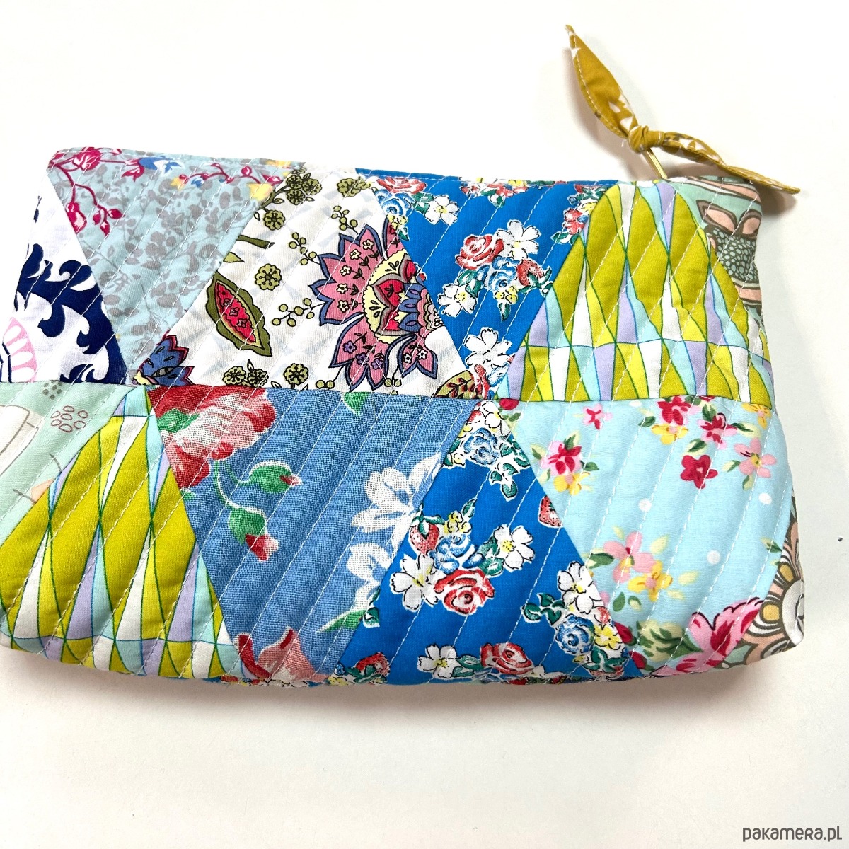 Przedstawiam patchworkową kosmetyczkę w odcieniach niebieskiego i zielonego, stworzoną z najwyższej jakości bawełnianych tkanin quilterskich premium. Każdy trójkąt ostał starannie zszyty, tworząc harmonijną i żywą kompozycję kolorystyczną.