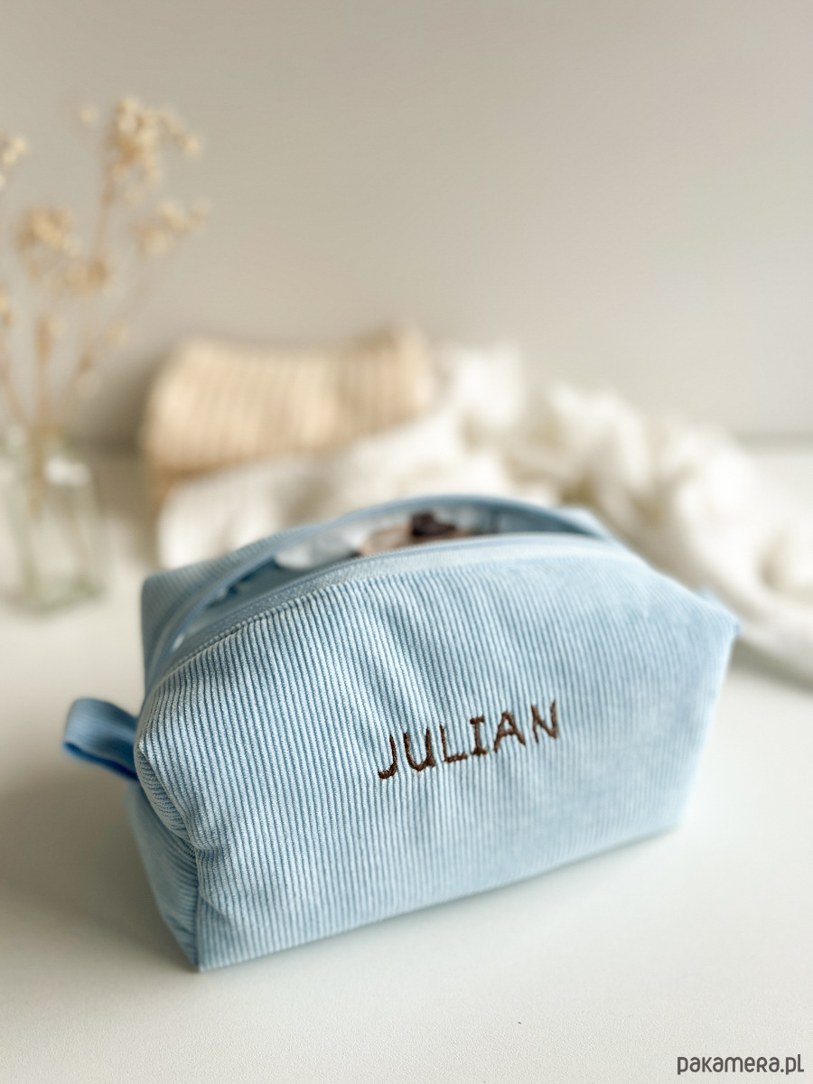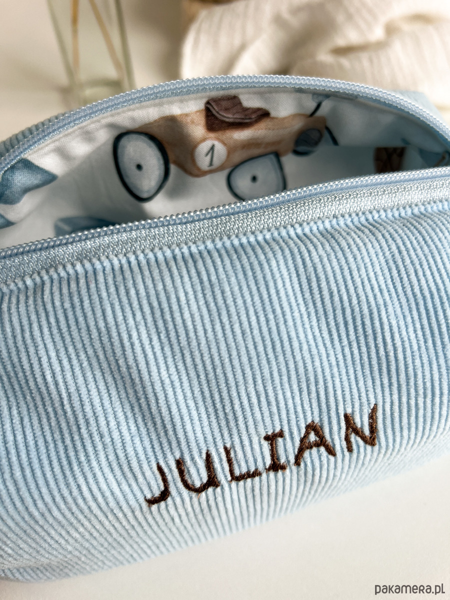 Miękka, ręcznie wykonana kosmetyczka z personalizowanym haftem — idealna na dziecięce kosmetyki, drobiazgi i rzeczy potrzebne podczas spacerów czy podróży.