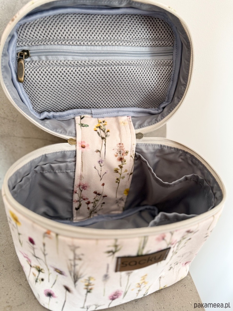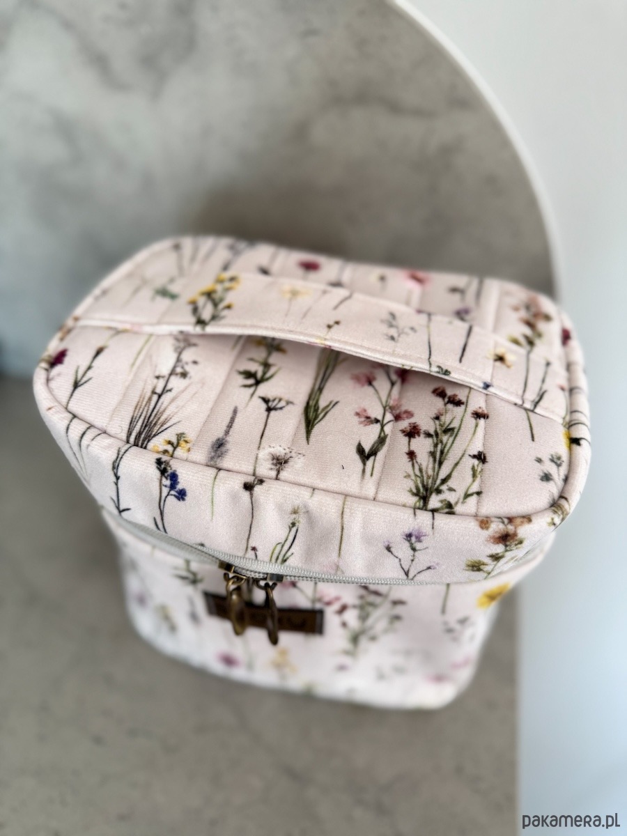 Zdecydowaną zaletą kosmetyczki podróżnik, jest jej lekkość i pakowność. Zamykana na zamek kosmetyczka będzie idealnym kompanem na wyjazd, z łatwością wpakujesz ją do małej walizki, czy bagażu podręcznego. Wieczko oraz dno są pikowane, dzięki czemu kosmetyczka nie tylko pięknie się prezentuję, ale i kosmetyki wewnątrz jest bezpieczne i mniej narażone na potłuczenie. Na wieczku kosmetyczki znajduje się kieszonka na zamek, idealna do przechowywania drobniejszych rzeczy, jak biżuteria, czy soczewki. W głównej komorze kosmetyczka ma trzy otwarte kieszonki, które świetnie sprawdzą się na mniejsze kosmetyki lub pędzelki.