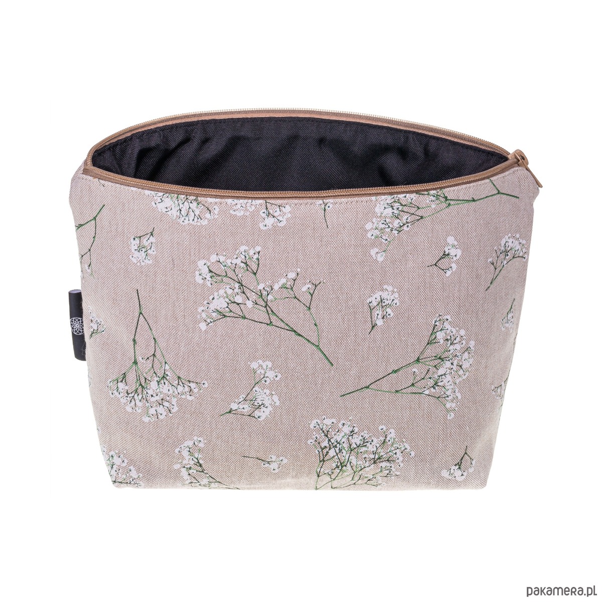 Pojemna kosmetyczka z bawełnianej tkaniny z motywem gipsówki o wyraźnym splocie wyglądającym jak len.