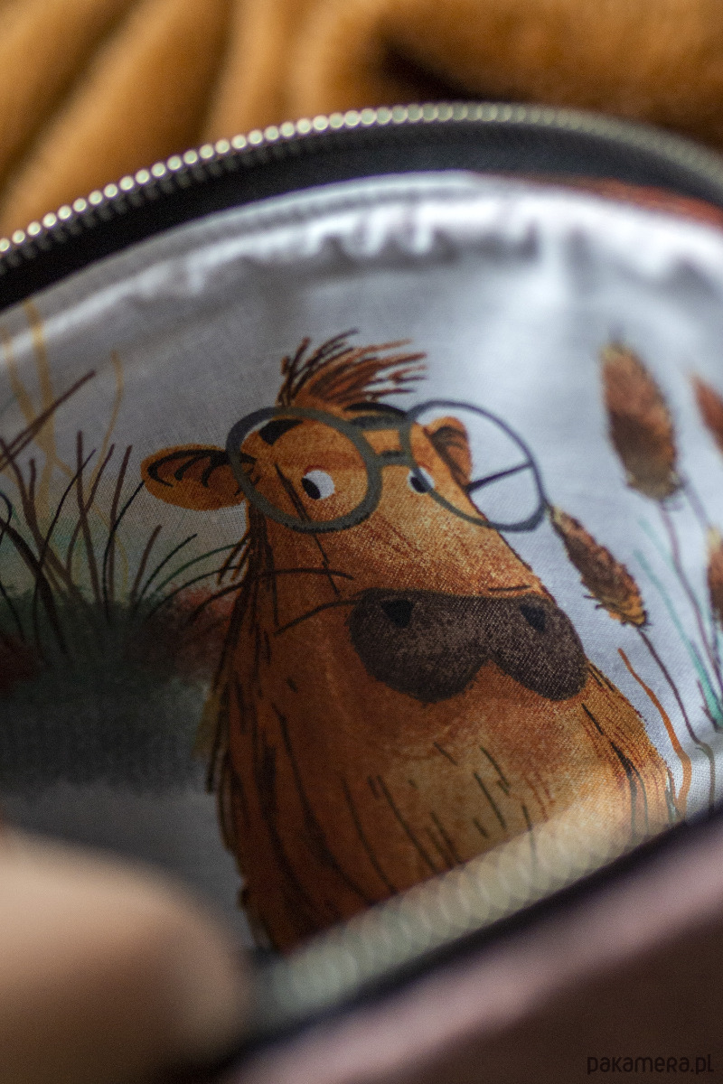 Kosmetyczka jest zapinana na suwak, w środku wszyta bawełniana podszewka.