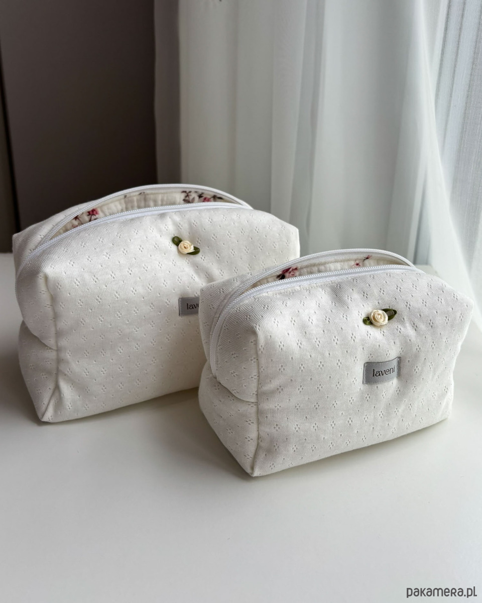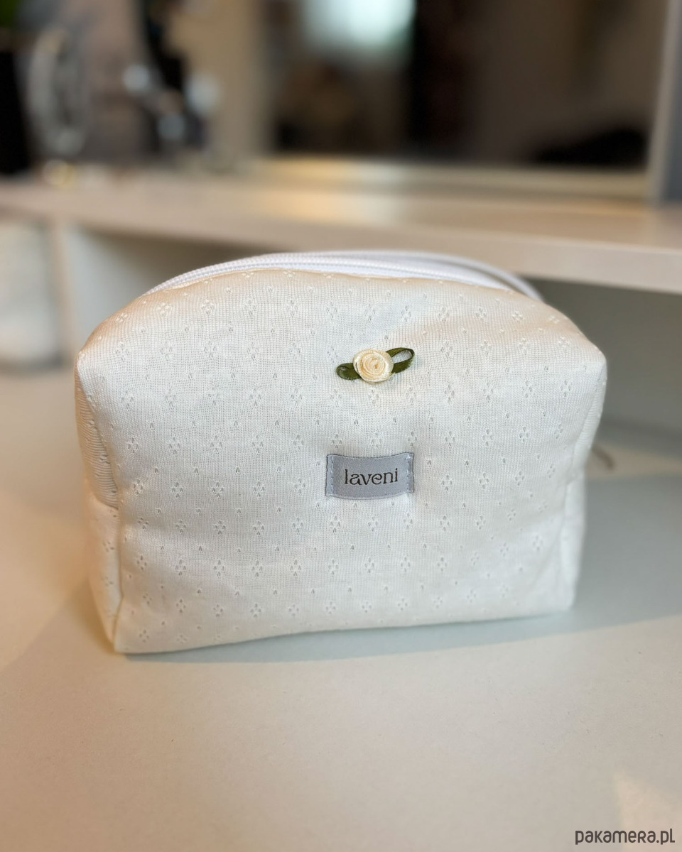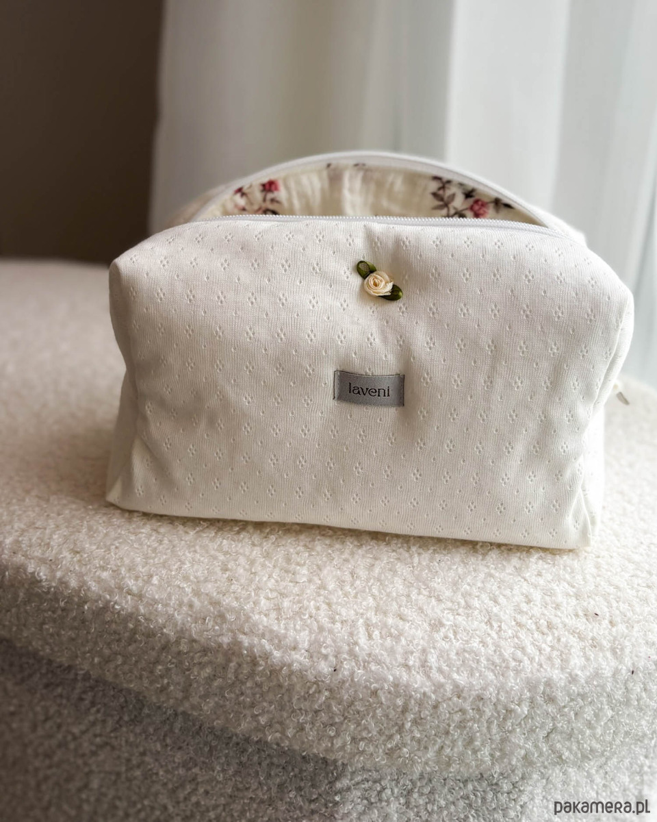 Minimalizm w najlepszym wydaniu. Kosmetyczka bawełniana Pointelle Cloudy Cream to połączenie śmietankowego ażuru i miękkiego muślinu w delikatne różyczki. Pasuje do każdej torebki, jest miękka, naturalna i niezwykle elegancka. Inspirowana najmodniejszym kolorem tego roku czyli cloud dancer. Kosmetyczka szyta ręcznie w Polsce, w mojej pracowni.