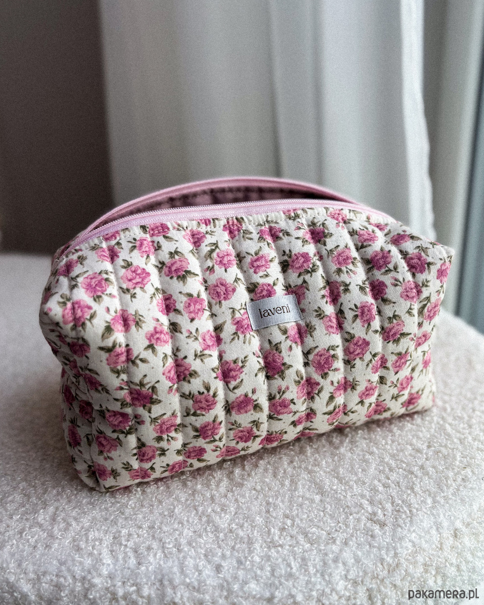 Ręcznie szyta kosmetyczka Romantic Rose z bawełny premium w kwiaty. Bawełniana podszewka w odcieniu dusty pink, miękka owata, która ochroni twoje kosmetyki. Idealna do torebki i na prezent.