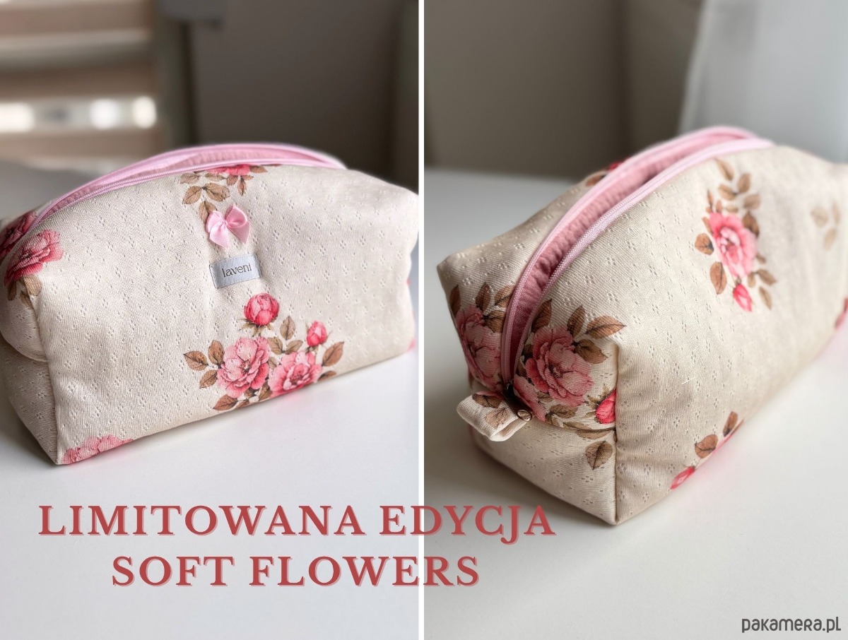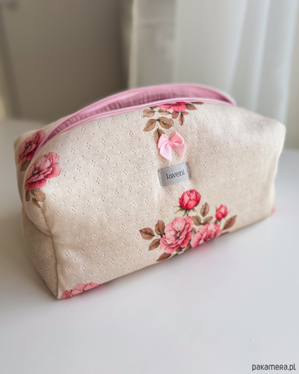 Limitowana, ręcznie szyta kosmetyczka Soft Flowers z ażurka bawełnianego w kwiaty. Wnętrze w odcieniu antycznego różu, jest uszyte z miękkiego, bawełnianego muślinu. Usztywniana owatą, chroni twoje kosmetyki. Idealna do torebki i na prezent dla bliskiej osoby.