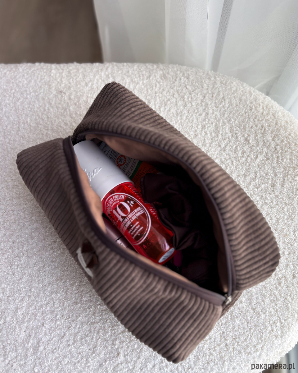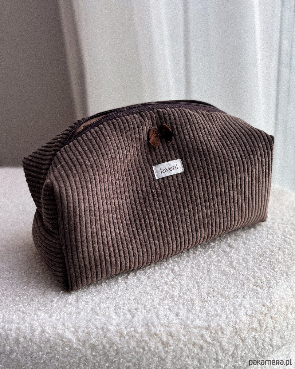 Miękka kosmetyczka ze sztruksowej tkaniny w odcieniu czekoladowego brązu. Ręcznie szyta, usztywniona delikatną owatą i podszyta miękkim muślinem w delikatne kwiaty. Idealna na kosmetyki, biżuterię lub drobiazgi do torebki.