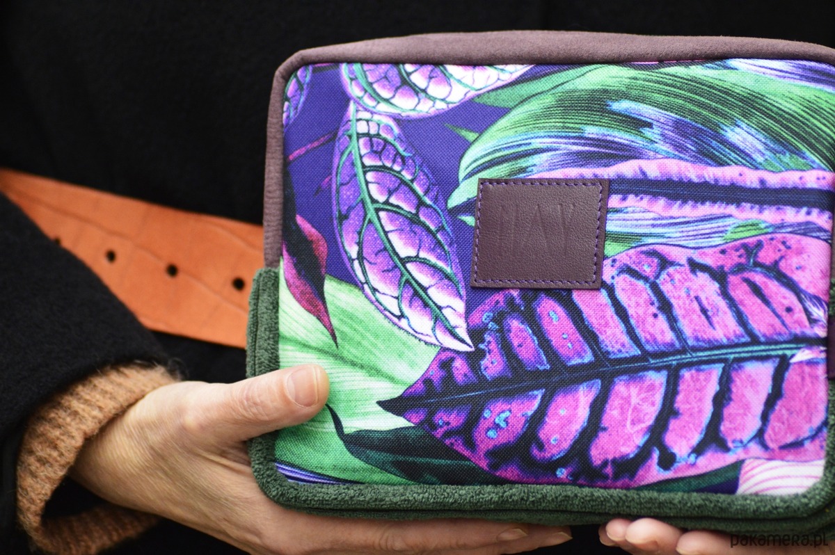 Całość powstała z tkanin tapicerskich, wodoodpornych, które zostały dodatkowo wzmocnione i usztywnione. Dodatkowe elementy : logo i pasek powstały ze skóry naturalnej. Wewnątrz znajdują się dwie kieszonki, jedna na suwak i dwie otwarte.