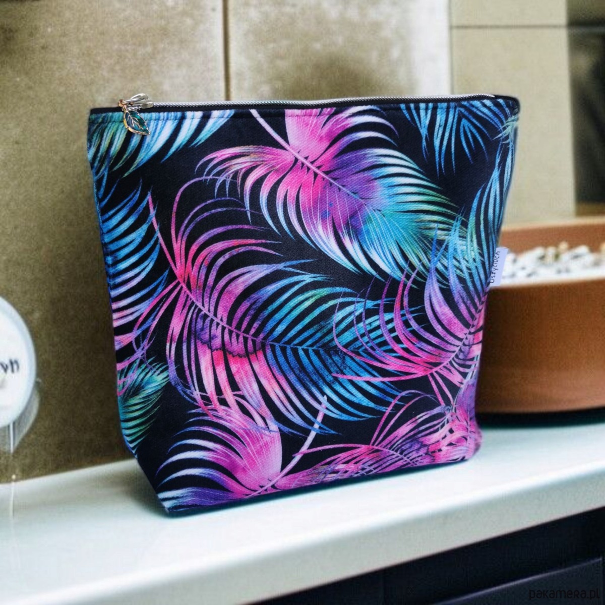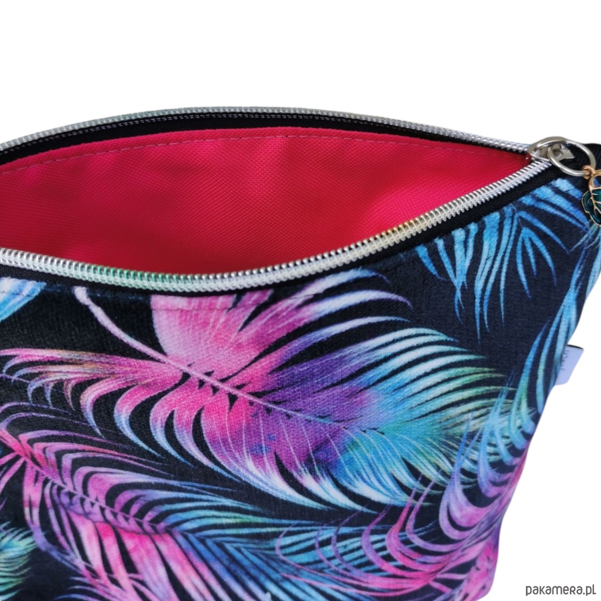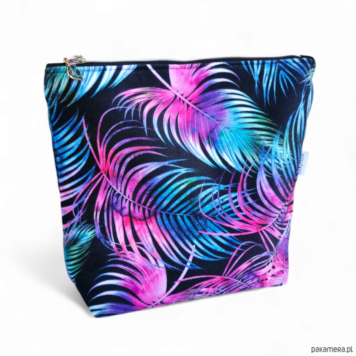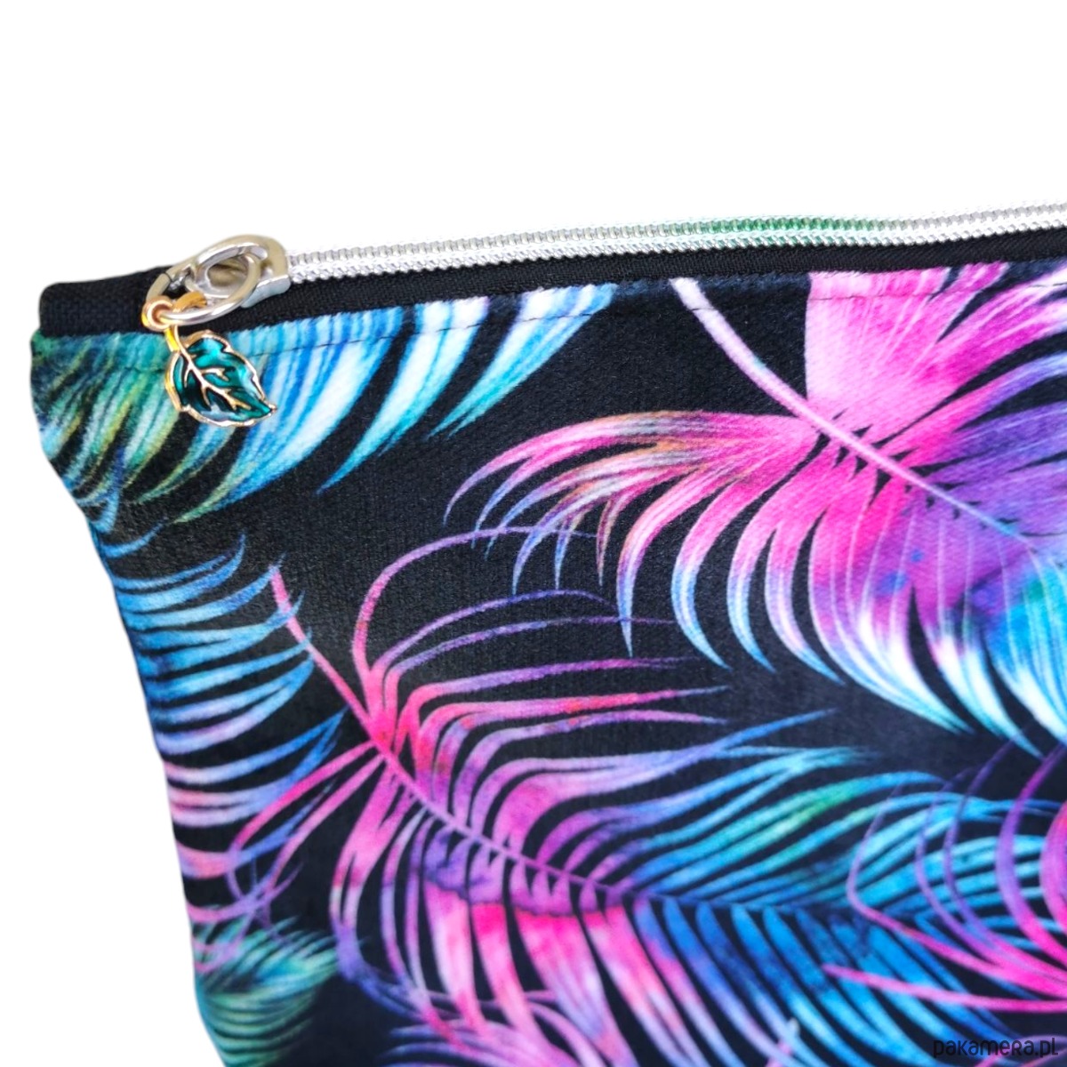 Kosmetyczka uszyta z najwyższej jakości weluru tapicerskiego z kolorowym wzorem. Welur ten jest bardzo przyjemny w dotyku, a jednocześnie wytrzymały i odporny na przetarcia.