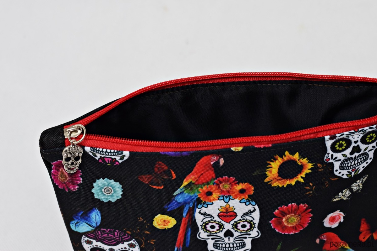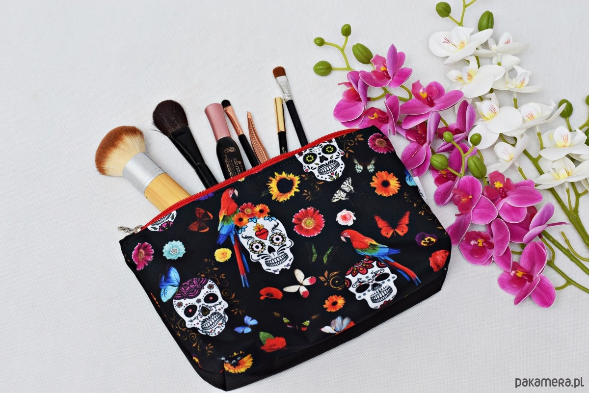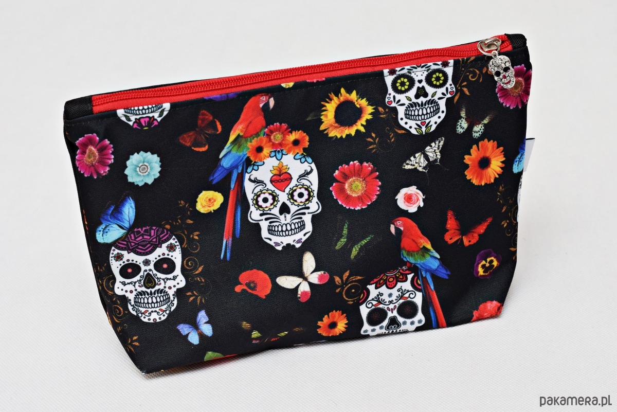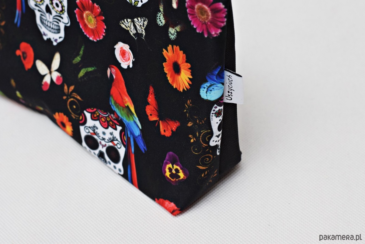 Kolorowa kosmetyczka. Uszyta z wodoodpornego materiału z wybranym wzorem z jednej strony, tył kosmetyczki czarny. Podszewka czarna.
