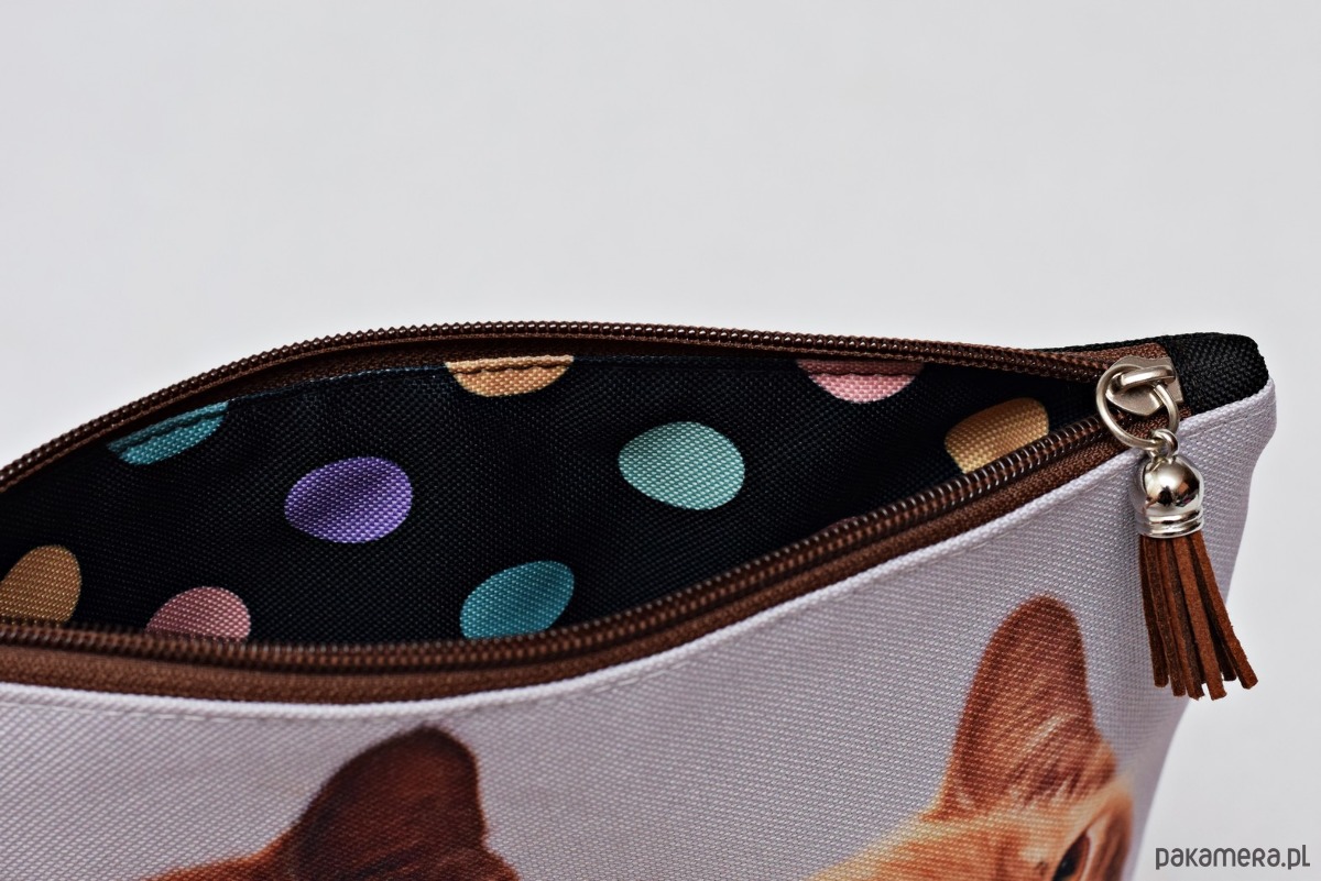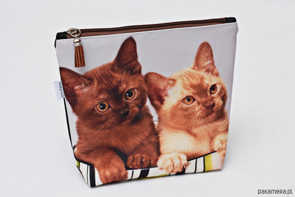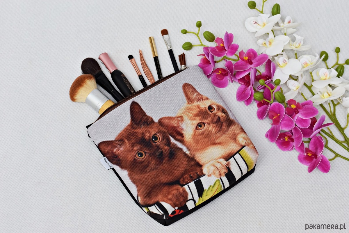Kolorowa kosmetyczka uszyta z wodoodpornego materiału z wzorem w kotki, tył czarny. Podszewka wodoodporna czarna w grochy.