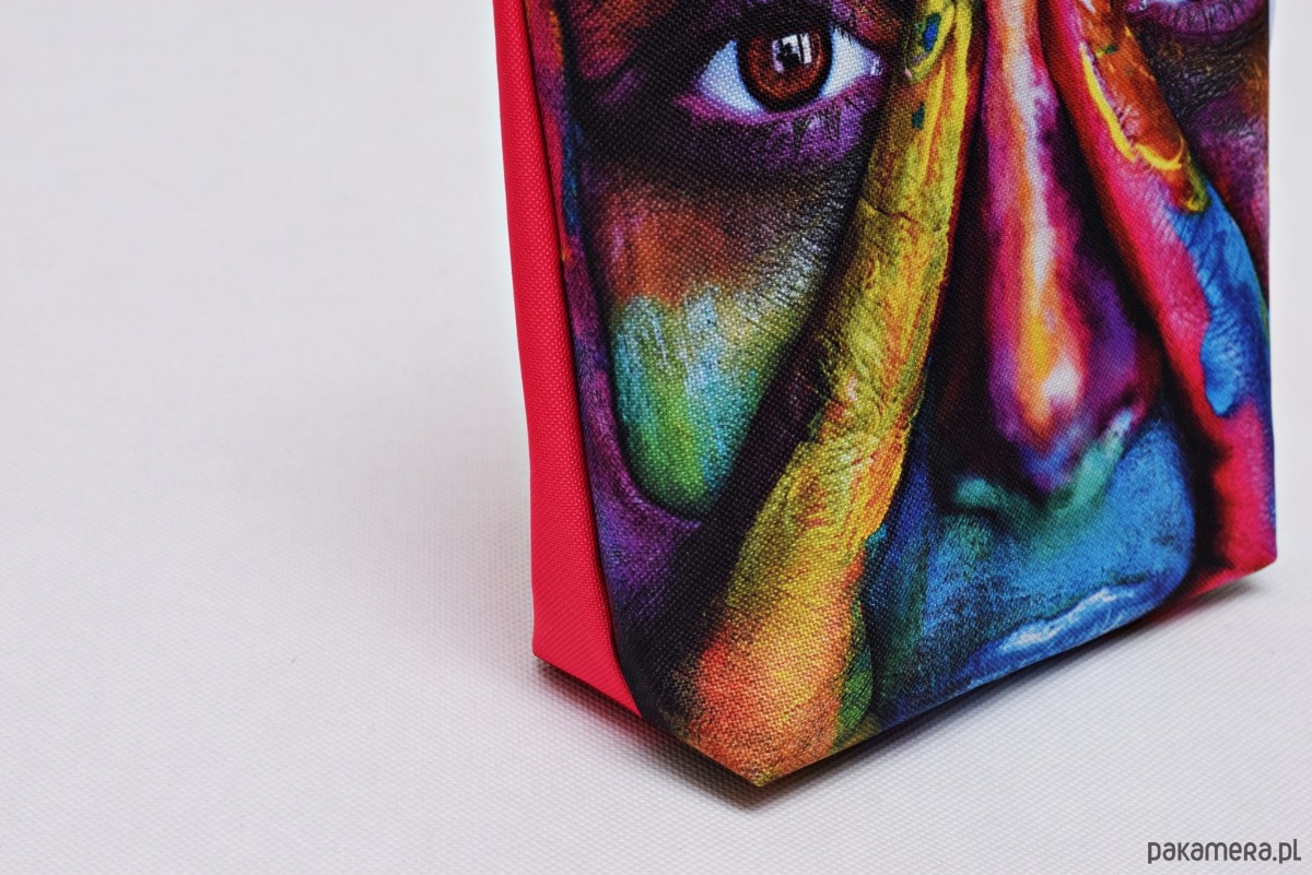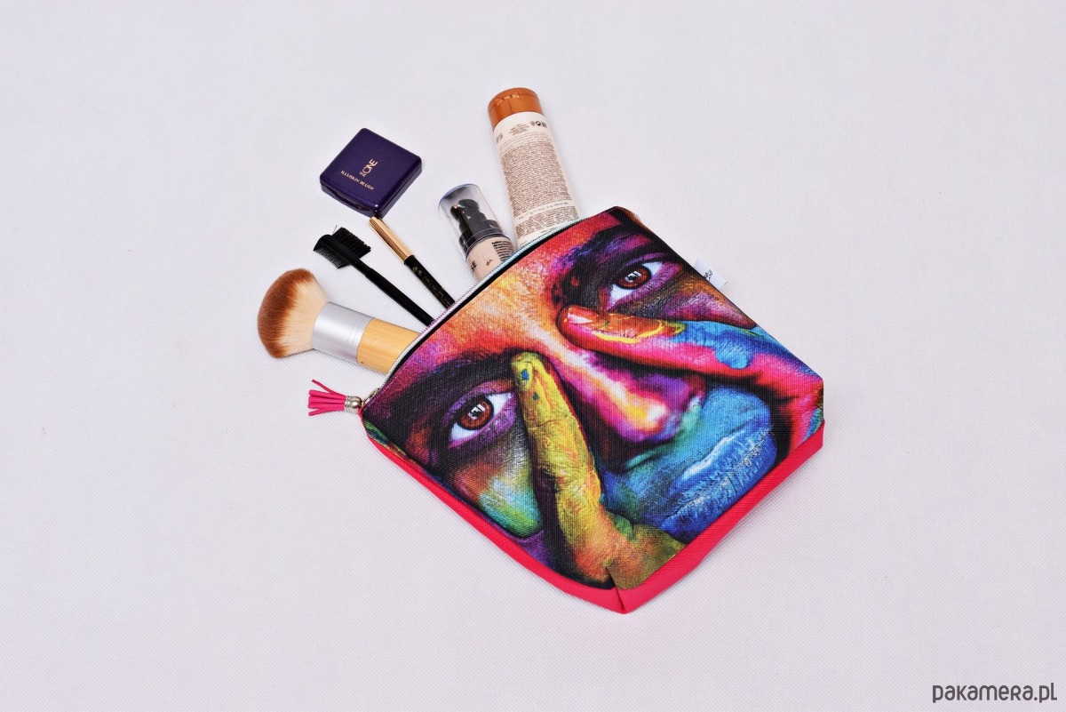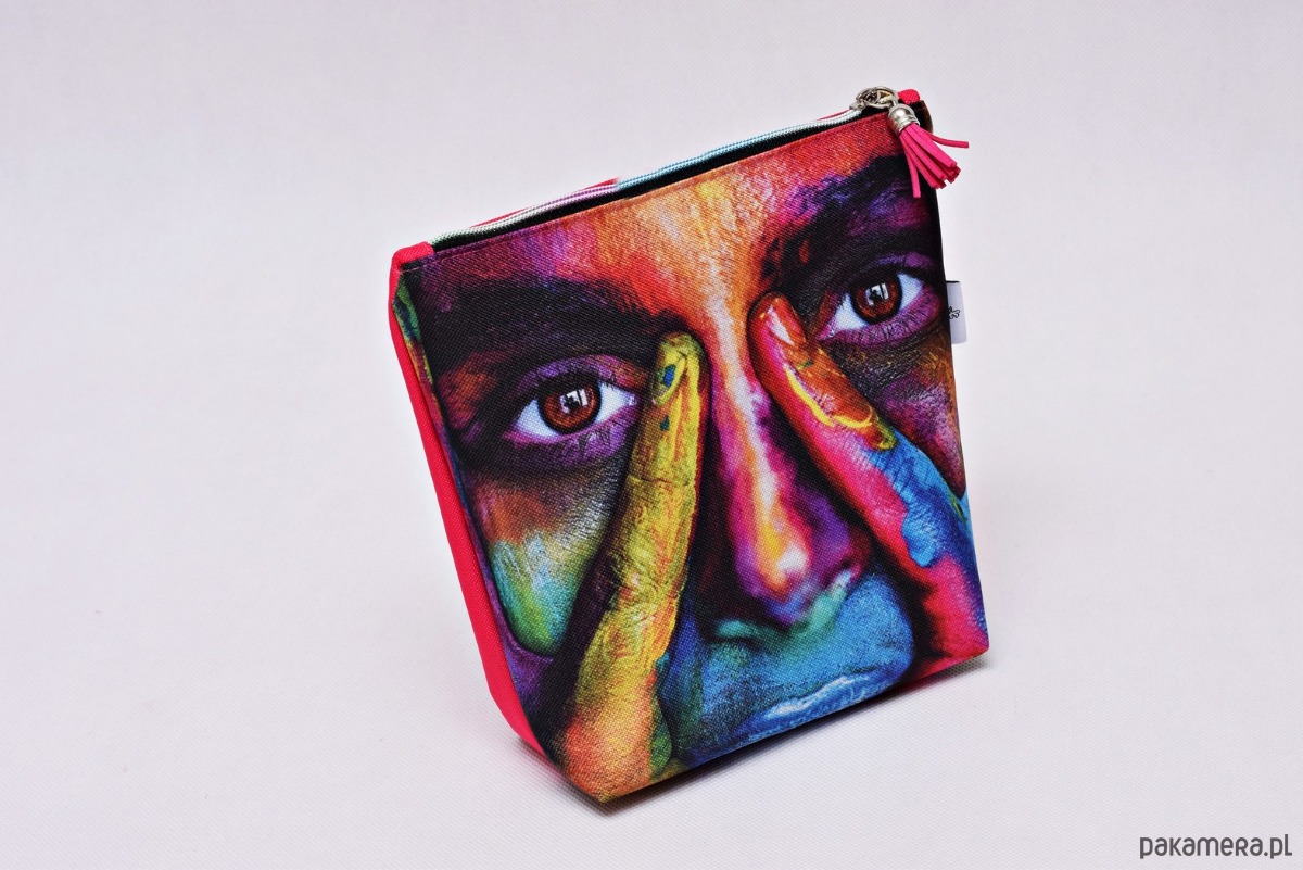 Kolorowa kosmetyczka. Uszyta z wodoodpornego materiału z wybranym wzorem z jednej strony, tył kosmetyczki różowy. Podszewka czarna.