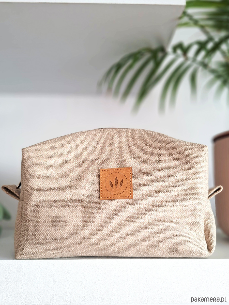 Średniej wielkości kosmetyczka z plecionej tkaniny tapicerskiej imitującej len.