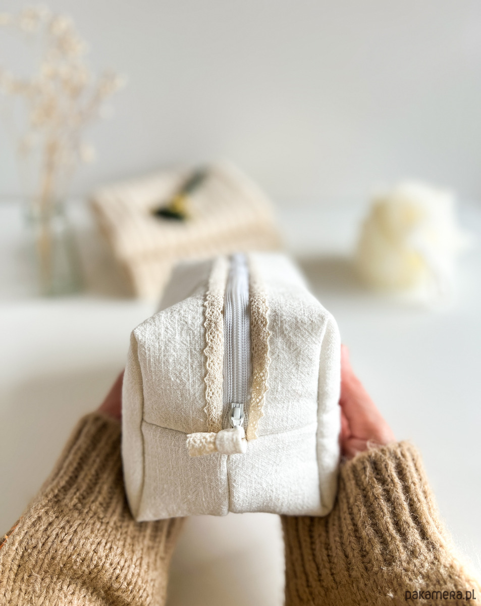 Delikatna koronka przy zamku dodaje całości romantycznego uroku i sprawia, że kosmetyczka prezentuje się niezwykle lekko i kobieco. To połączenie estetyki, tradycyjnego rękodzieła i codziennej funkcjonalności.
