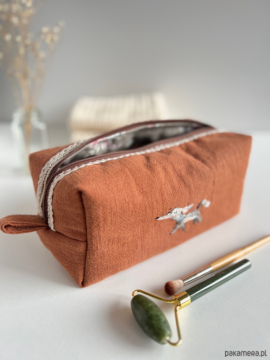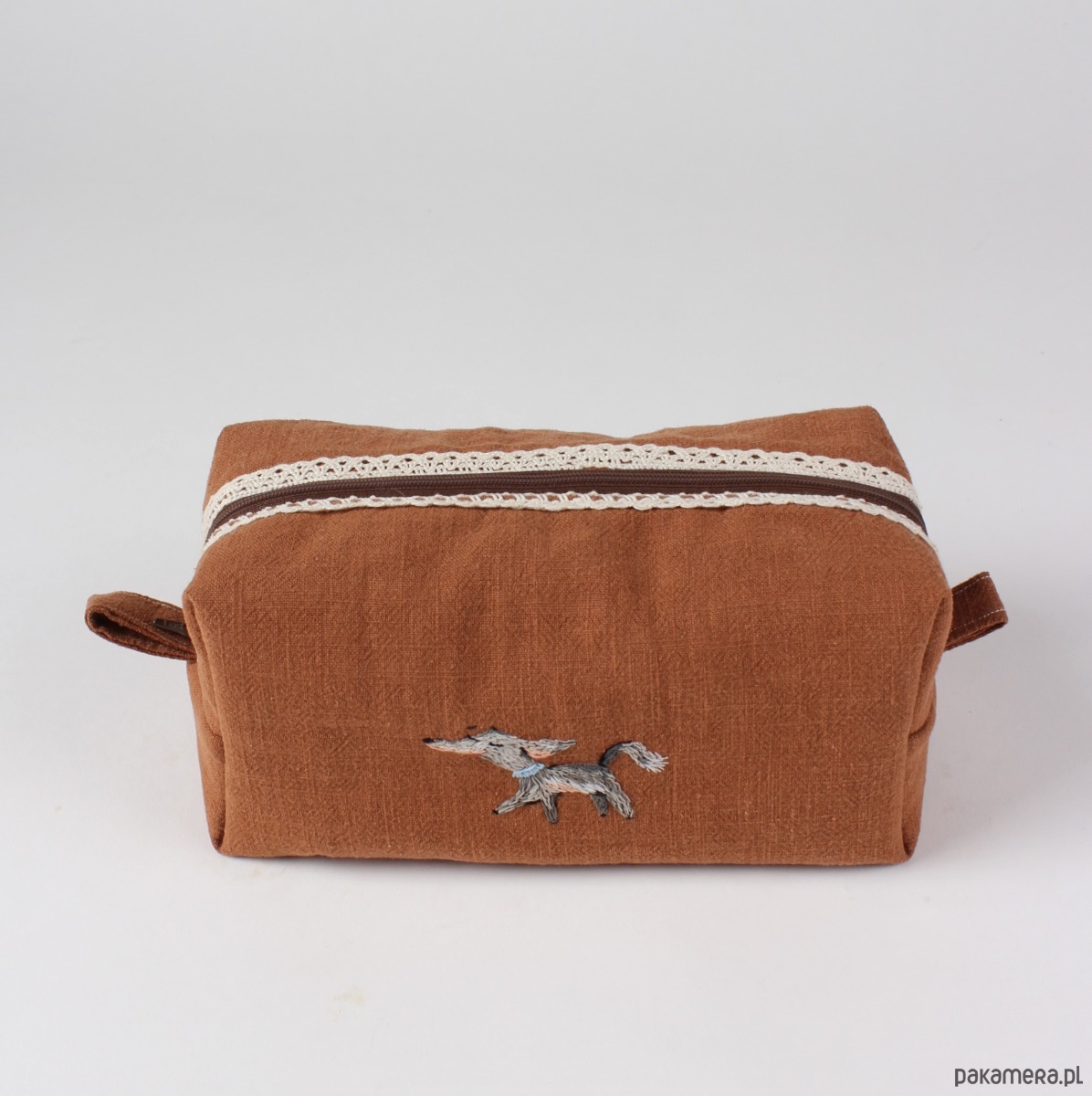 Elegancka, subtelna i wyjątkowa kosmetyczka uszyta z brązowego lnu. Naturalna tkanina w połączeniu z ręcznym haftem pieska nadaje jej niepowtarzalnego, rzemieślniczego charakteru.
