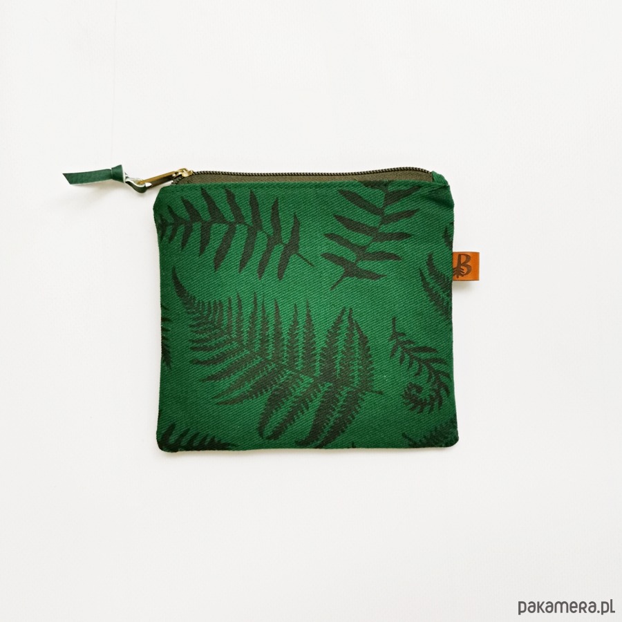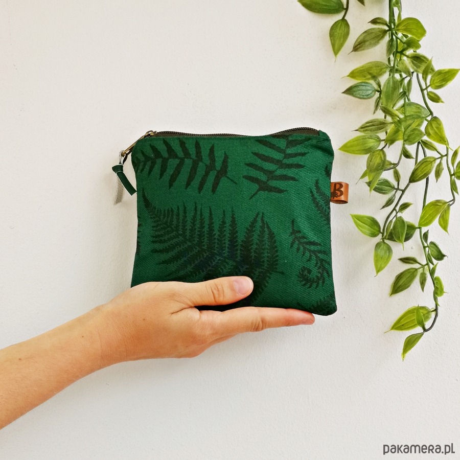Zielona kosmetyczka w paprocie, uszyta została z grubej bawełny.