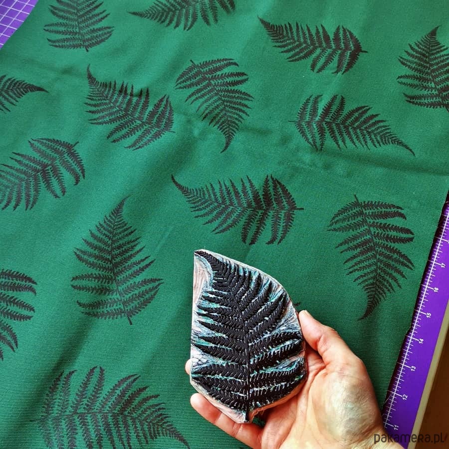 Tkaninę ozdobiłam autorskim wzorem paproci, który naniosłam za pomocą samodzielnie zrobionych stempli. Wzór został utrwalony, nie zmywa się, jest unikatowy i niepowtarzalny.