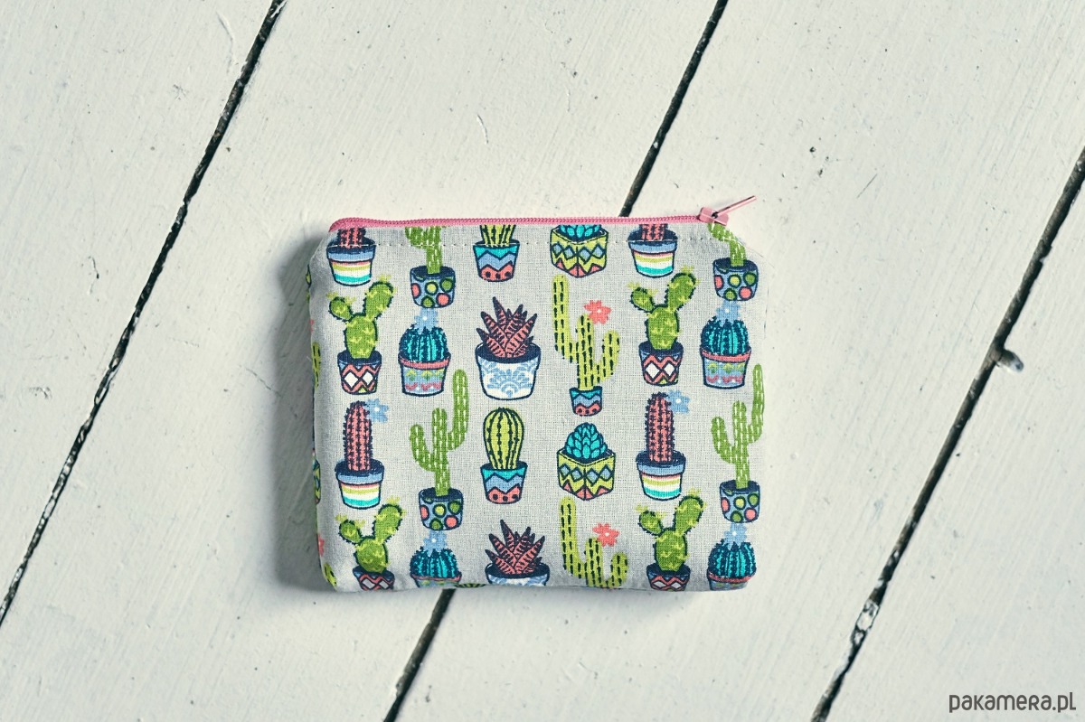 Mała kosmetyczka z bawełnianej tkaniny w kolorowe kaktusy.