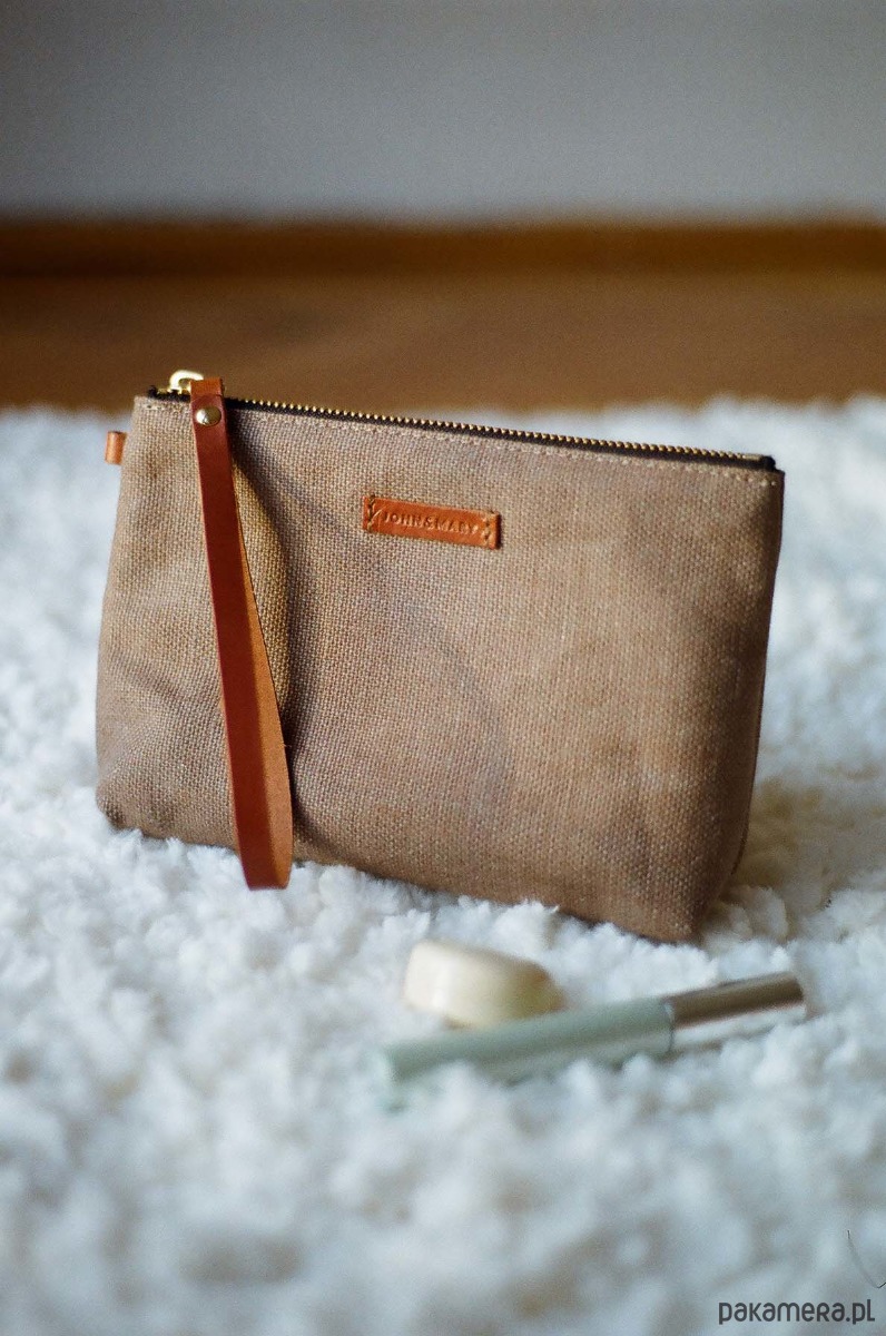 Kosmetyczka wykonana jest z 100 % lnu w szaro-brązowym kolorze. W środku wykończona jest niebieską podszewką z lniano-bawełnianej tkaniny (50% len/ 50 % bawełna). Na środku kosmetyczki znajduje się skórzana naszywka z logo JOHN & MARY.