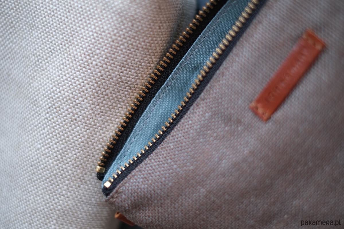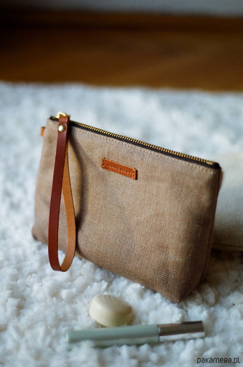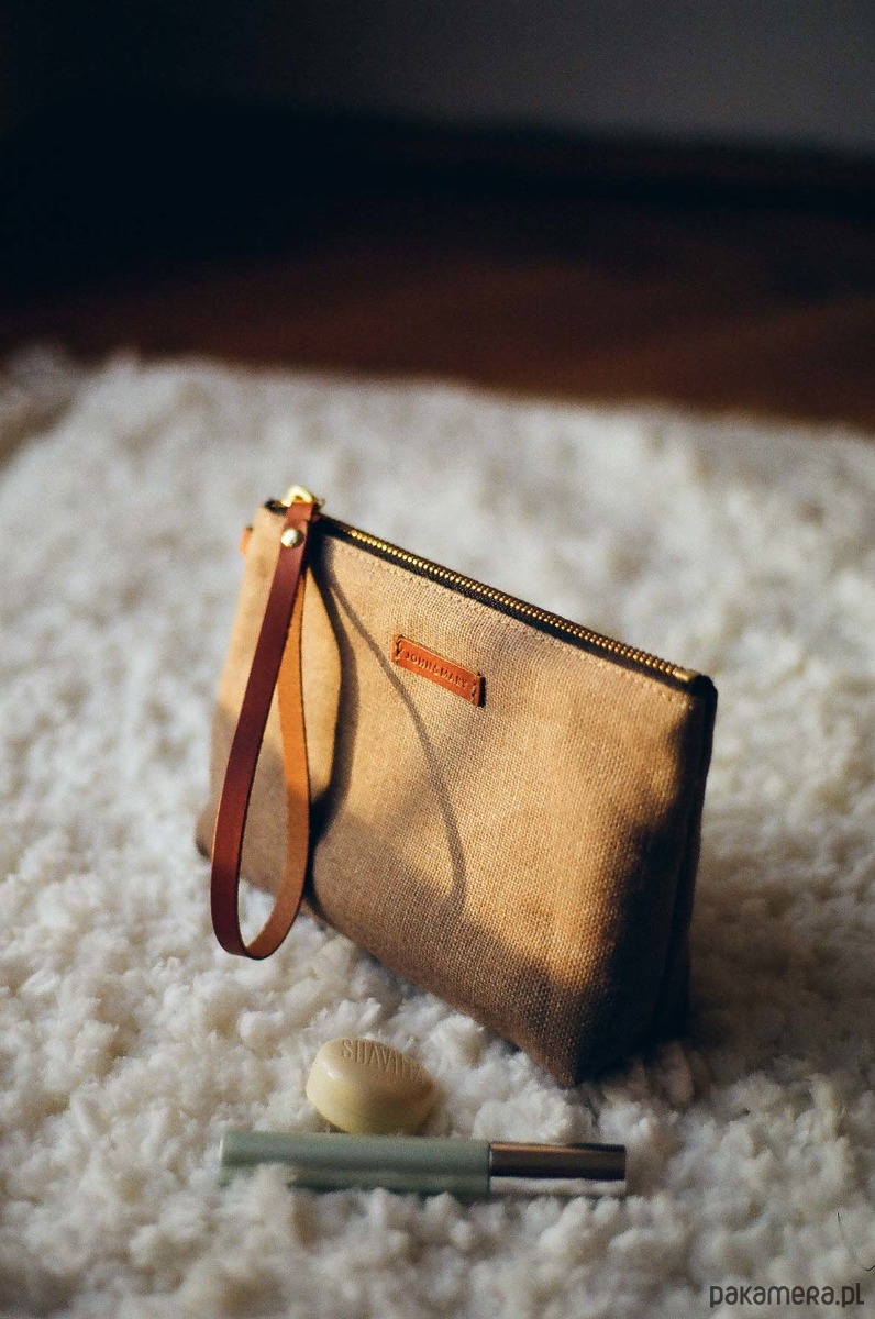 Pojemna kosmetyczka na akcesoria do makijażu, lub drobne kosmetyki. Może również służyć jak mała torebka, dzięki wygodnemu uchwytowi na rękę, wykonanemu z koniakowej skóry. Zapinana na metalowy suwak firmy YKK.