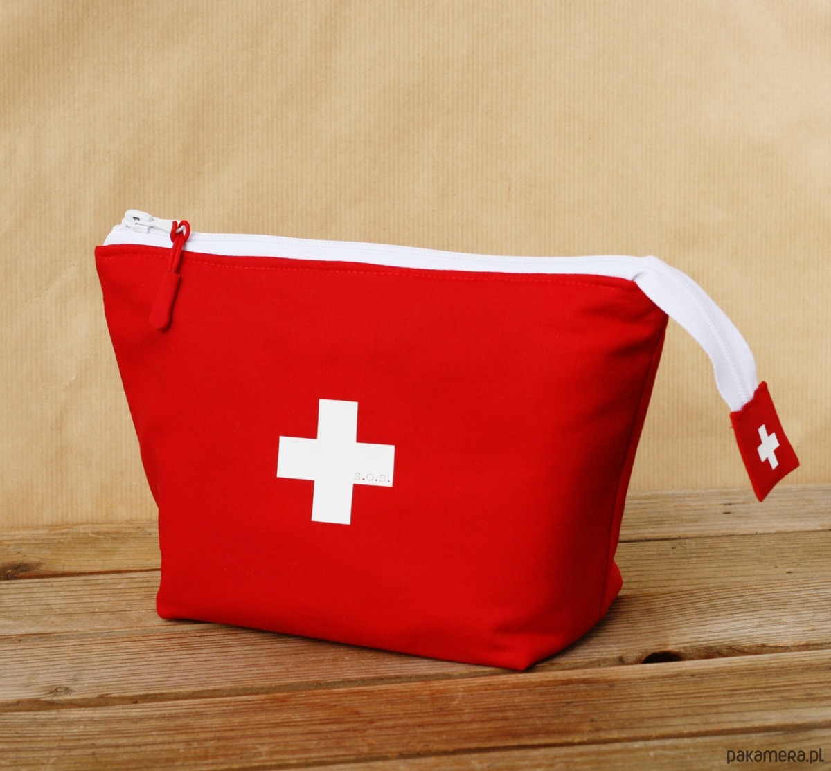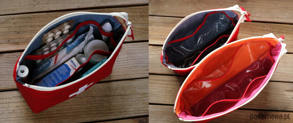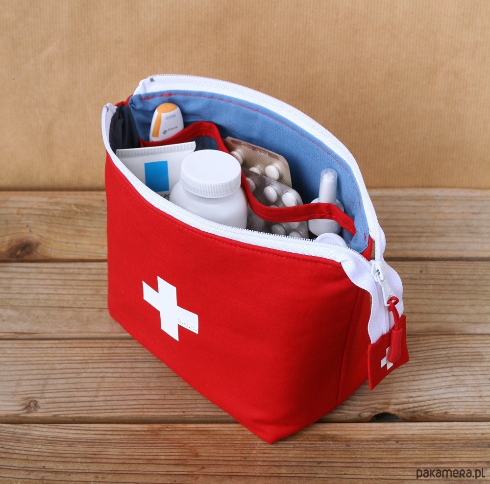 Kosmetyczko-apteczka, która pomieści niezbędne leki w podróży. Kosmetyczka uszyta z bawełny, cienkiej ociepliny i miękkiej folii. Posiada kieszonki z przeźroczystej folii, do których można wsunąć mniejsze leki, termometr, bandaż. Na środku zaś można poustawiać buteleczki i pudełka z lekami. Idealna na krótszy wyjazd lub na mniejsze potrzeby. W ofercie również posiadamy apteczkę familijną.