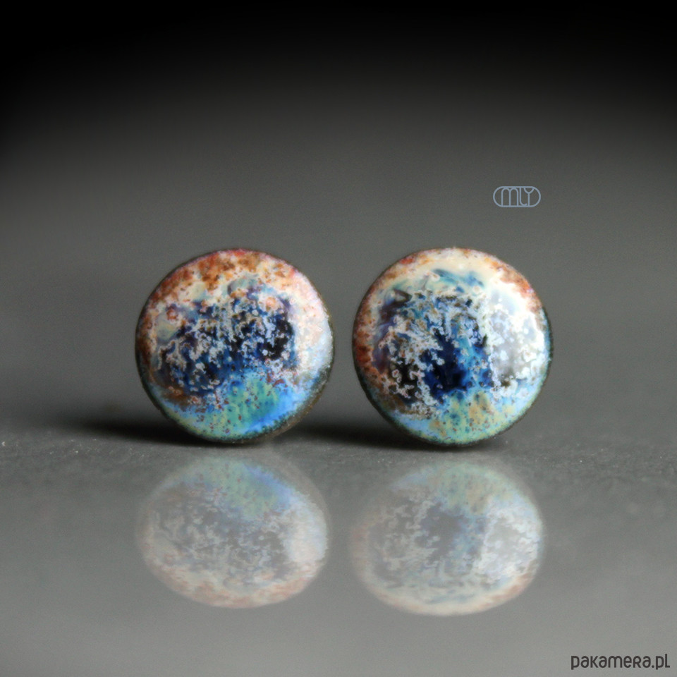 Ceramiczne okrągłe kolczyki w formie sztyftów, ręcznie wykonane z delikatnej gliny kamionkowej, jednostronnie szkliwione szarych beżowych i błekitnych szkliw z efektem plamek, na antyalergicznych sztyftach w kolorze srebrnym. Średnica ok. 9mm. Polecam