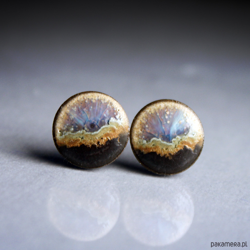 Ceramiczne okrągłe kolczyki w formie sztyftów, ręcznie wykonane z delikatnej ciemnoszarej gliny kamionkowej, jednostronnie szkliwione mieszanką błyszczących i matowych szarych beżowych i czarnych szkliw z efektem plamek, na antyalergicznych sztyftach w kolorze srebrnym. Średnica ok.16mm. Polecam