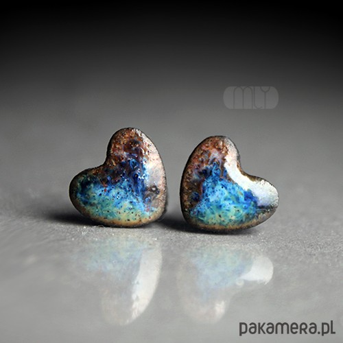 Ceramiczne kolczyki w formie sztyftów, ręcznie wykonane z delikatnej gliny kamionkowej, jednostronnie szkliwione beżowo błękitnym szkliwem z efektem plamek i subtelnym połyskiem, na antyalergicznych sztyftach w kolorze srebrnym.Średnica ok. 12mm.. Polecam